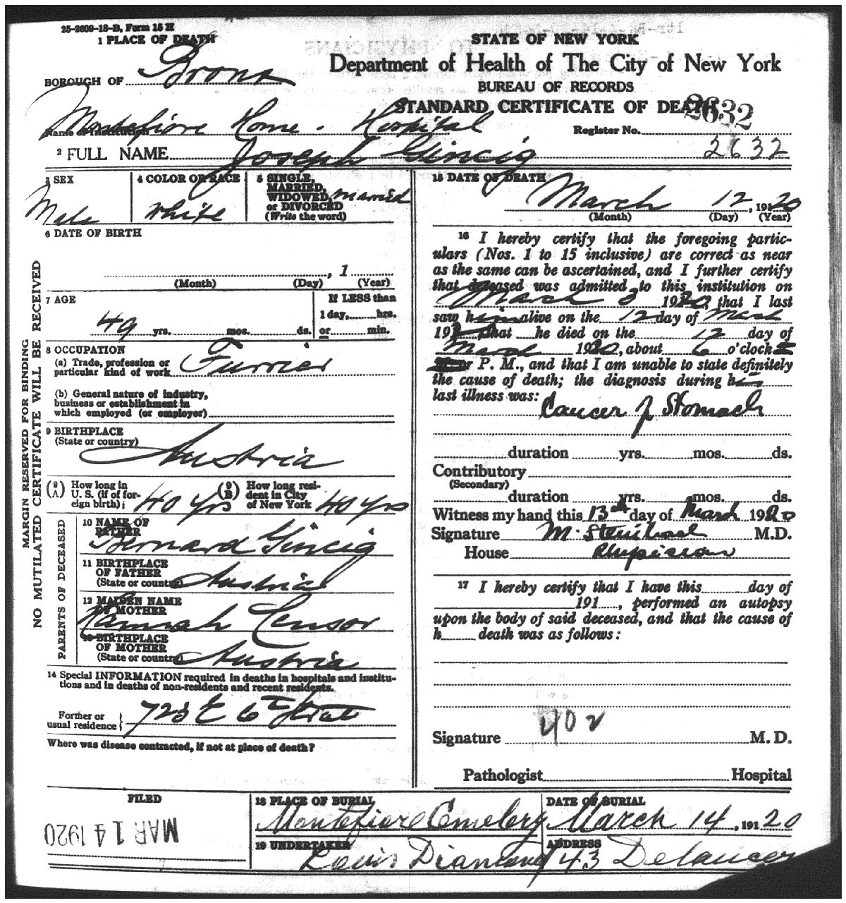 Died: March 12, 1920 at Montefiore Home-Hospital, Bronx, New York (certificate #2632).