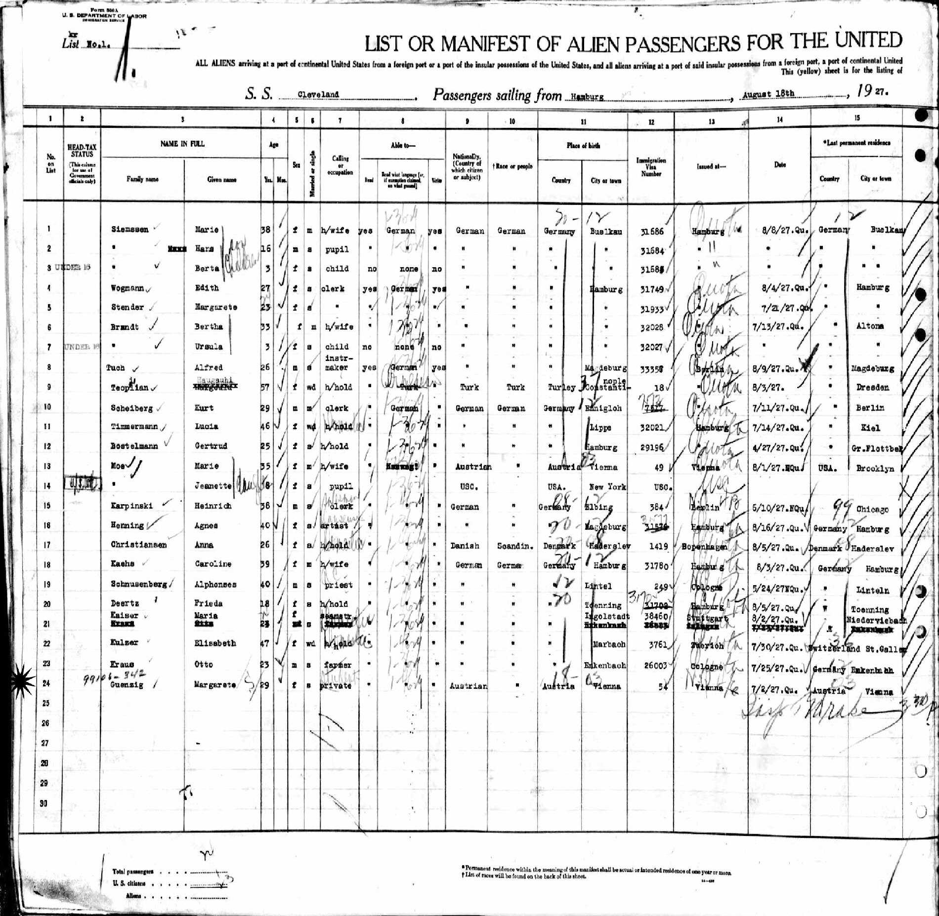 Born: May 13, 1898 in Vienna, Austria. Ship: Cleveland. Hamburg to New York.