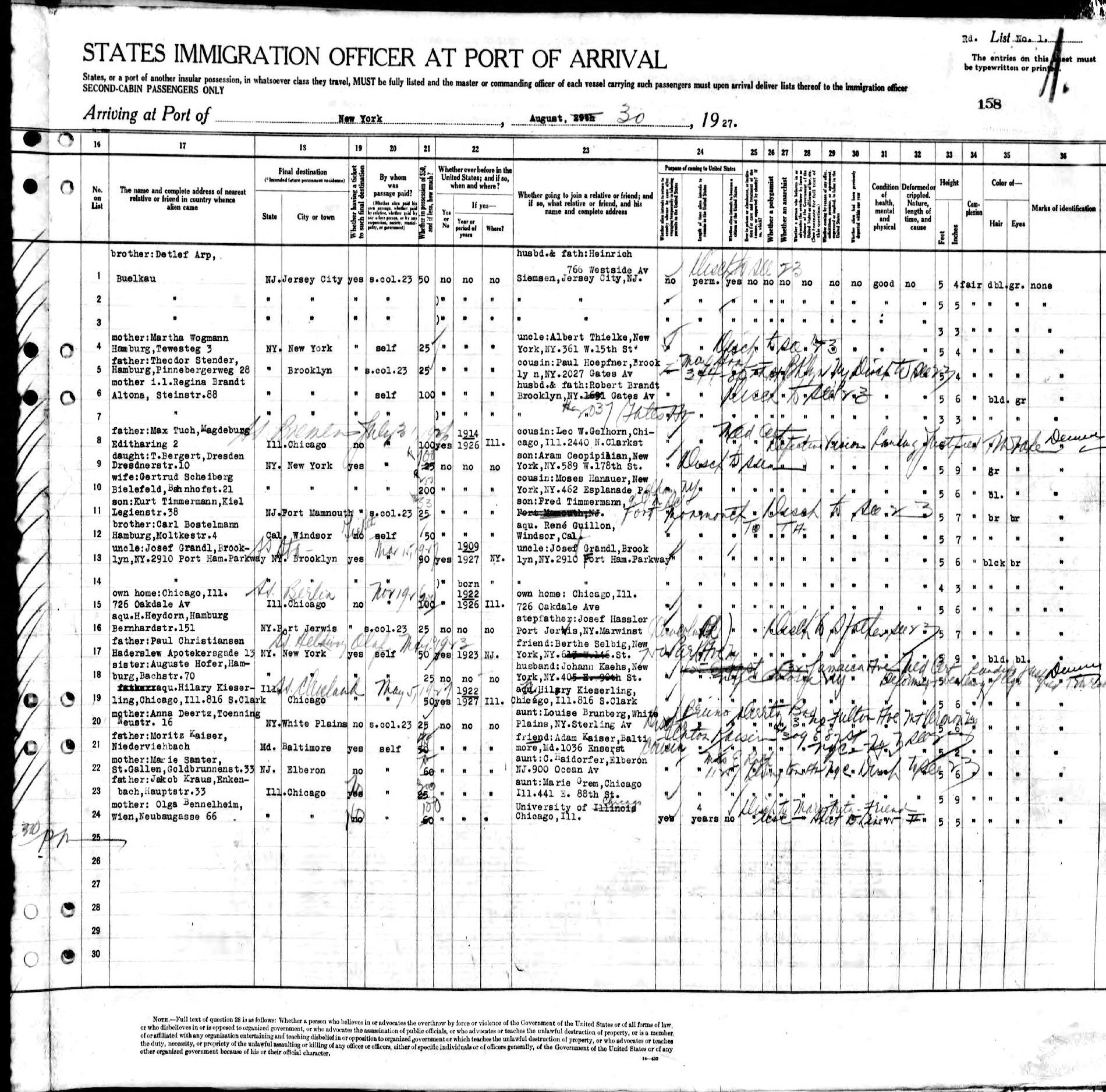 Immgration: August 30, 1927.