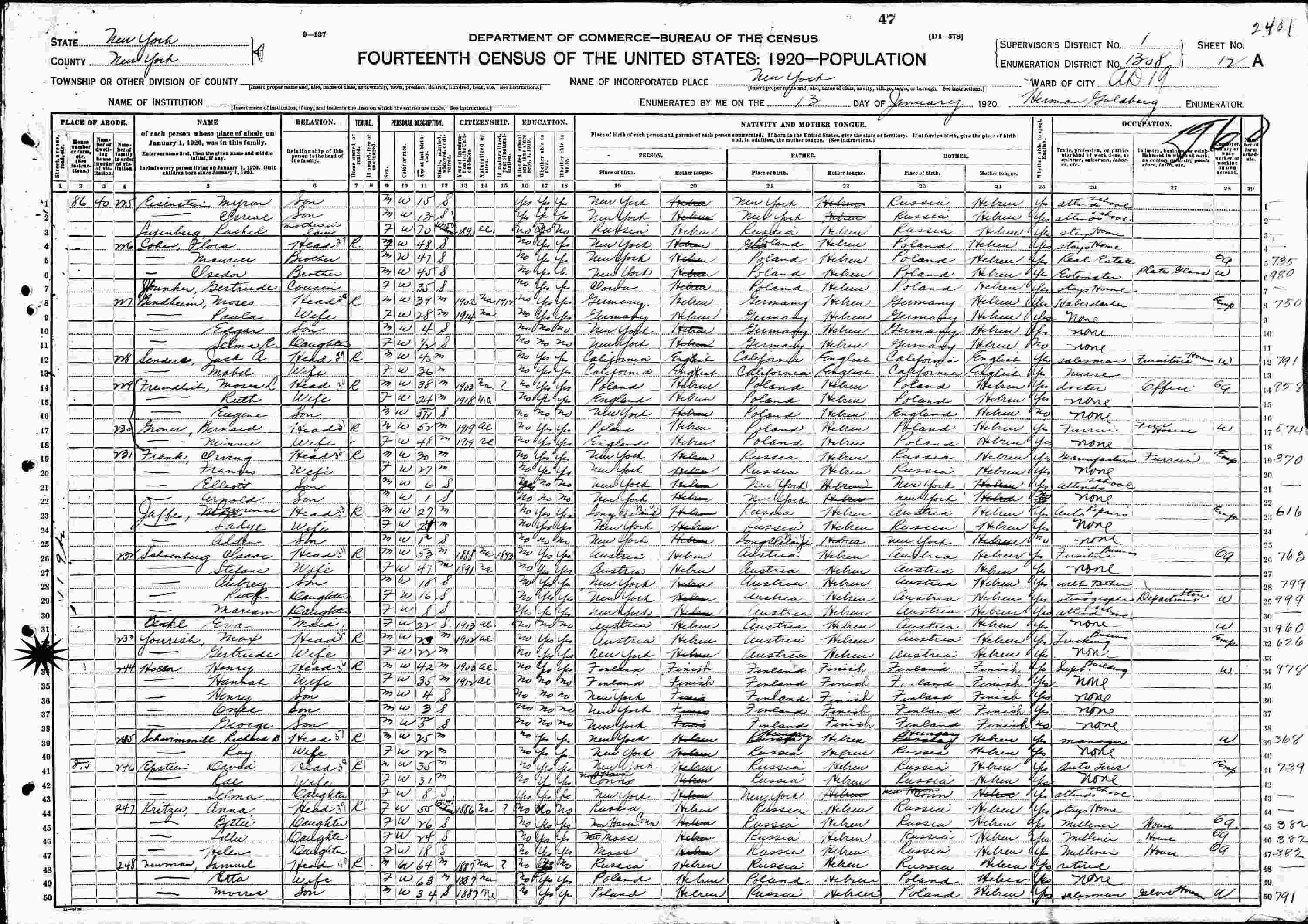 January 13, 1920 - 86 119th, Assembly District 19, Supervisor's District 1, Enumeration District 1308, New York City, New York (in same building as Isaac and Stefani Schoenberg).