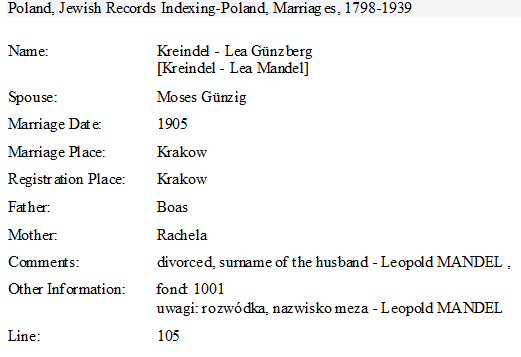 Married Kreindel-Lea (nee Ginzberg) Mandel 1905 in Krakow, Poland.