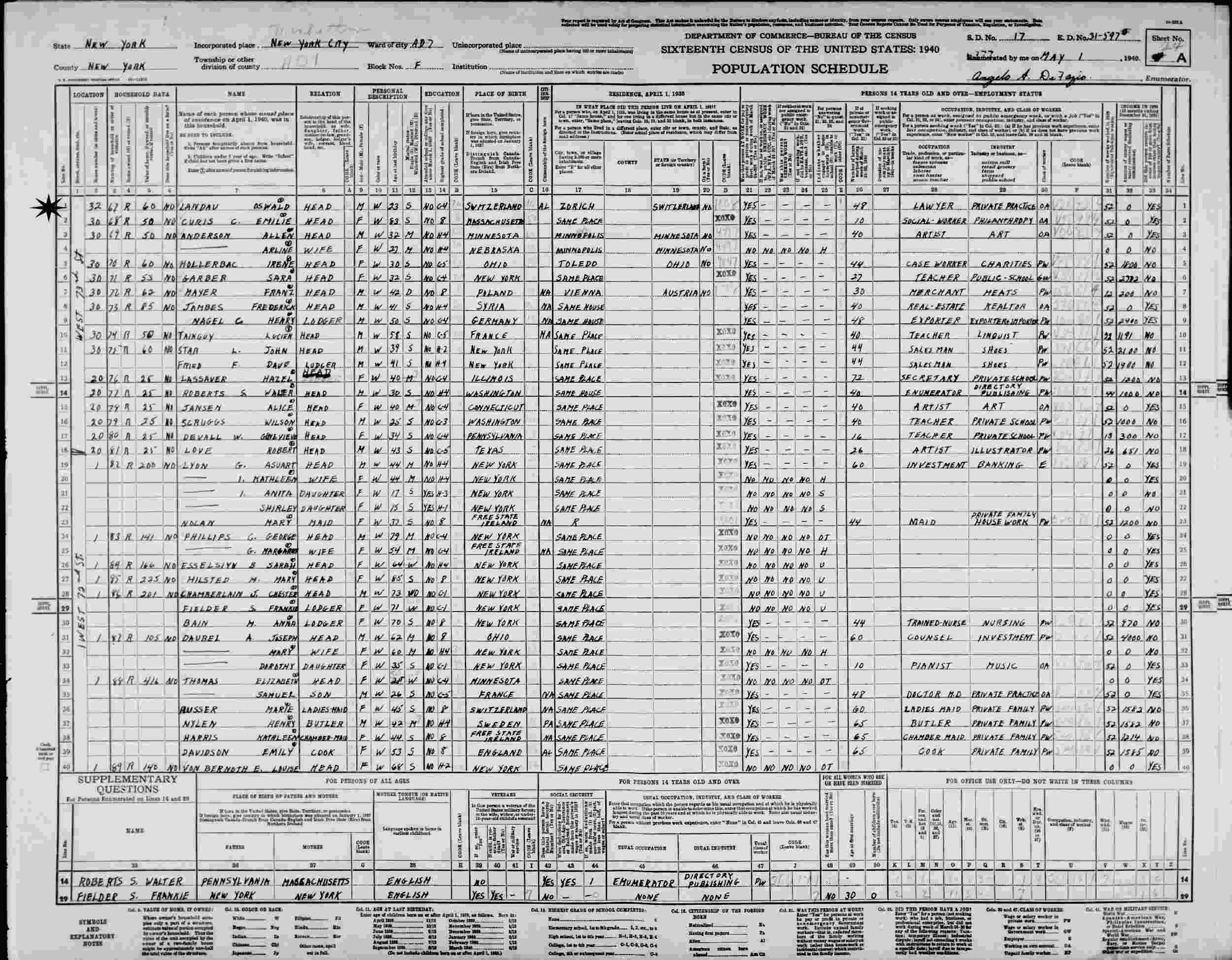May 1, 1940 - 32 West 73rd St, Block F, Assembly District 1, Supervisor's District 17, Enumeration District 31-697, Manhattan, New York.