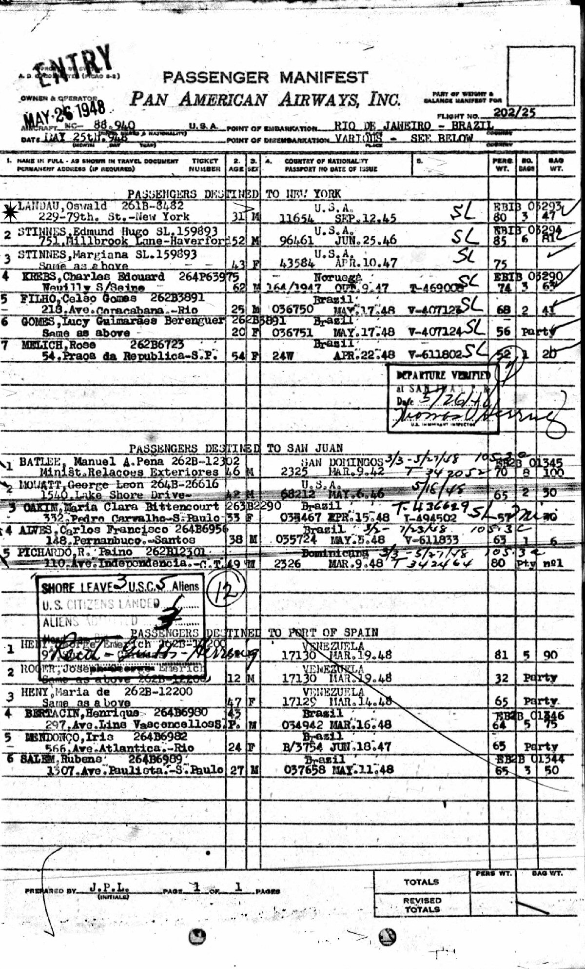 May 25, 1948 - San Juan Puerto Rico to U.S., Pan Am Airlines