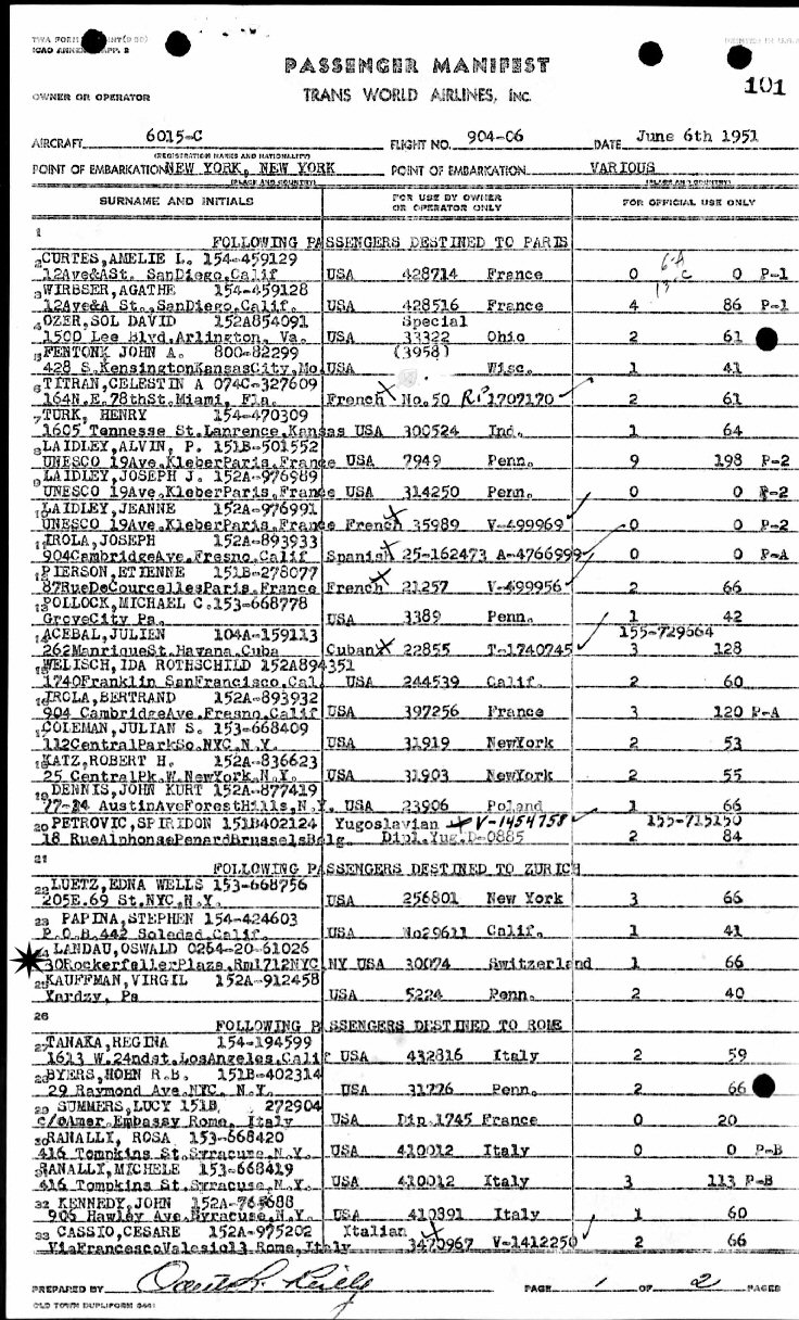 February 1, 1952 - Passenger List - Zurich, Switzerland to U.S. - TWA