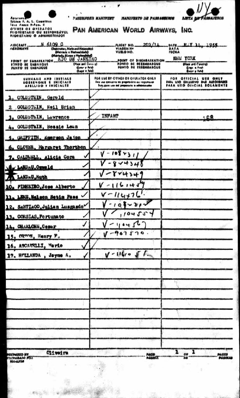 May 15, 1955 - Rio de Janeiro, Brazil to New York City, New York (PanAm Airlines) (w/Ruth)
