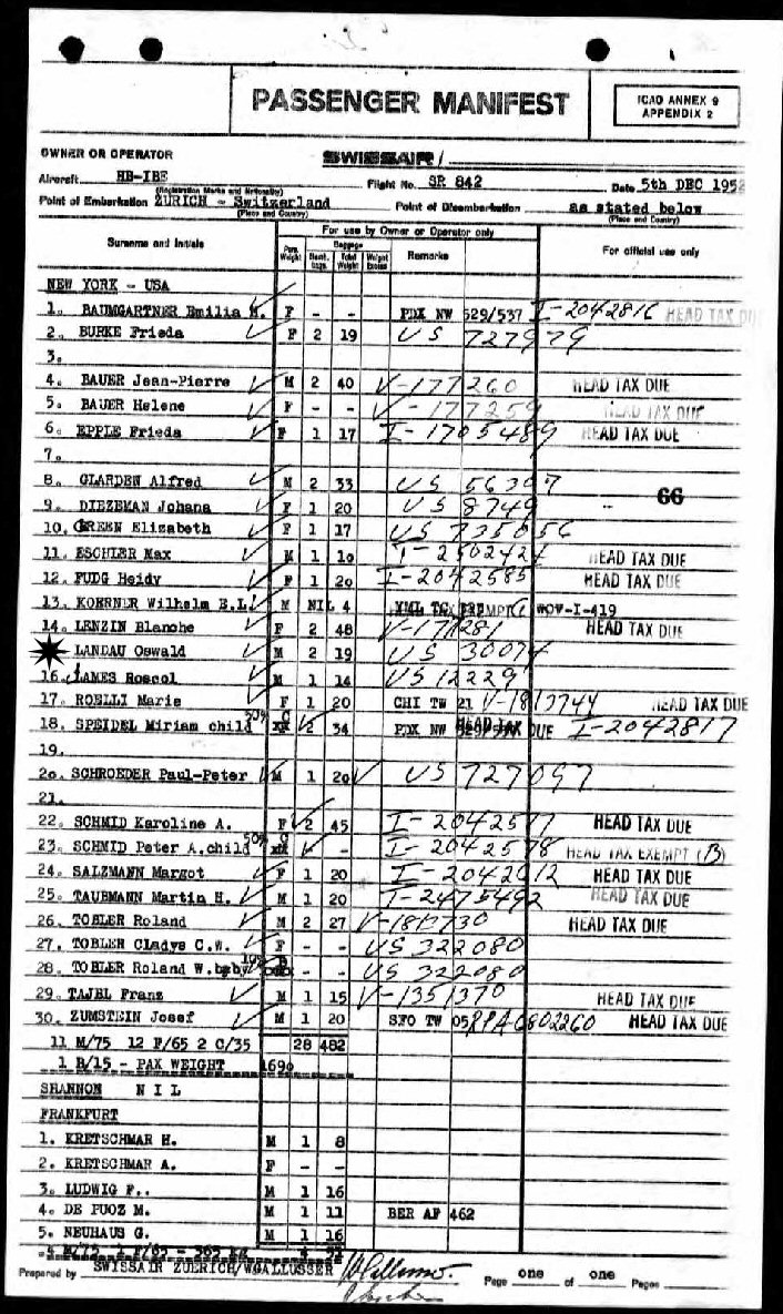 December 6, 1952 - Zurich, Switzerland to New York City, New York (Swiss Air)