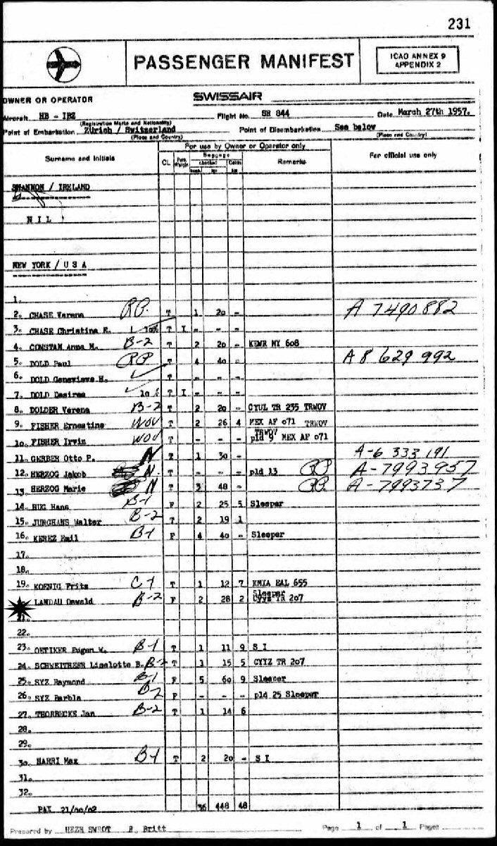 March 28, 1957 - Zurich, Switzerland to New York City, New York - Swiss Airlines