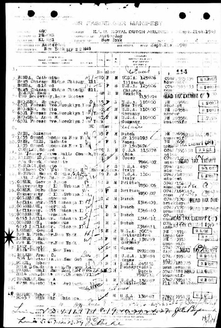 September 22, 1949 - Amsterdam, Netherlands to New York City, New York (KLM Roydal Dutch Airlines) (w/Ruth)