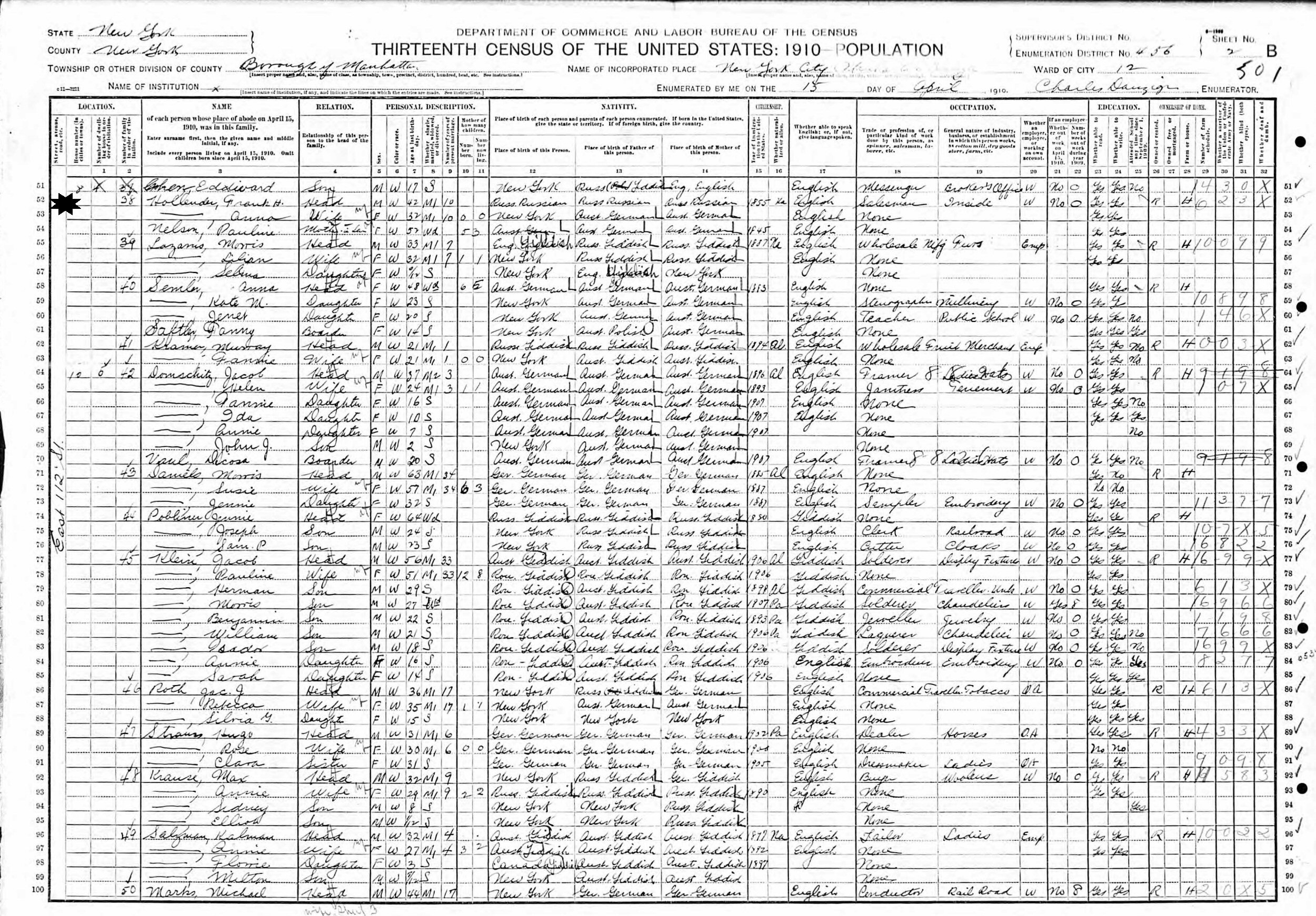 April 15, 1910 - 8 East 112 Street, Supervisor's District ?, Enumeration District 456, Ward 12, Manhattan, New York City, New York with daughter Anna and son-in-law, Frank.