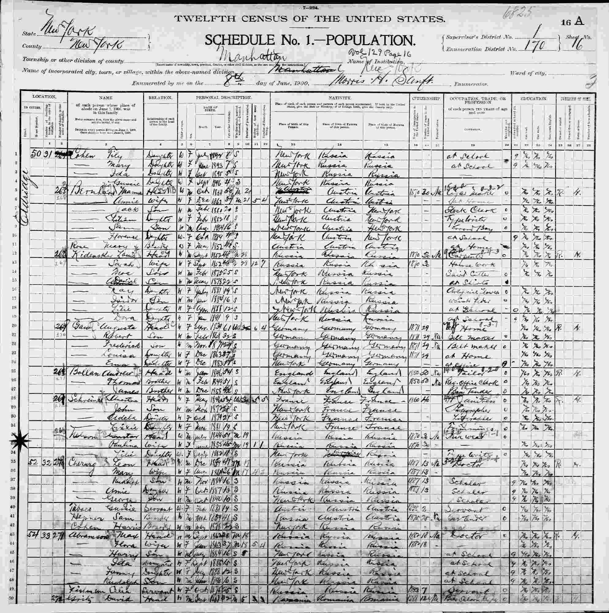 June 8, 1900 - 50 Eldridge, Supervisor's District 1, Enumeration District 170, Manhattan, New York.