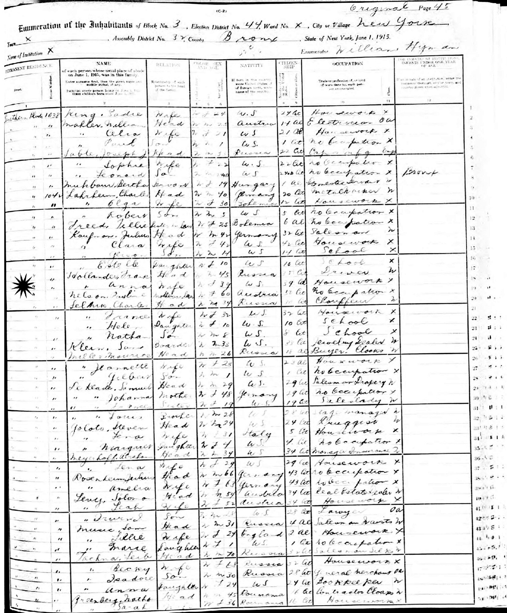 June 1, 1915 - (New York State Census) - 1038 Southern Boulevard, Assembly District 32, Block 3, Election District 44, Ward X, Bronx, New York.
