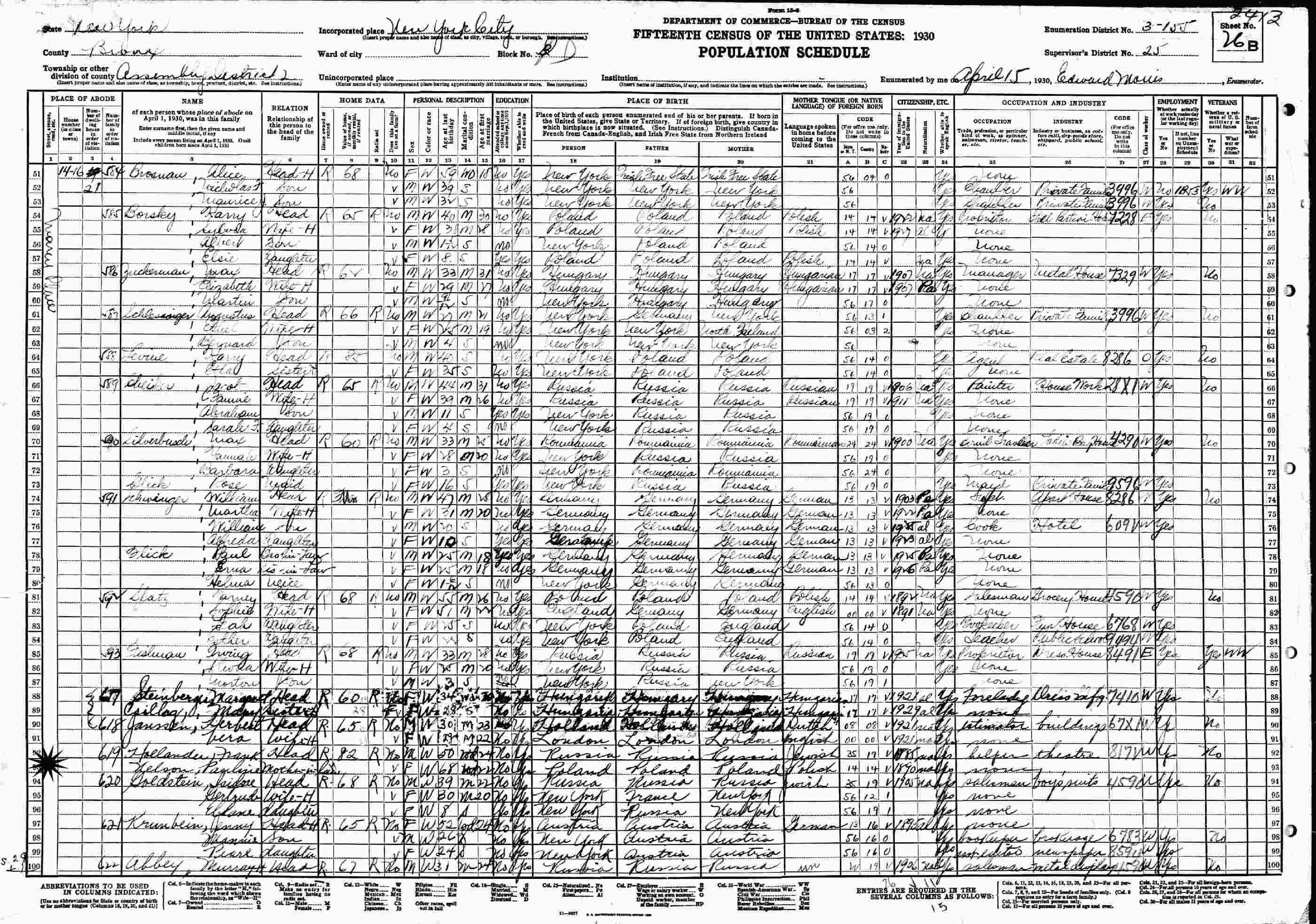 April 15, 1930 - 14-16 Marcy Place, Assembly District 2, Supervisor's District 25, Enumeration District 3-155, New York City, Bronx, New York w/son-in-law, Frank Hollander.