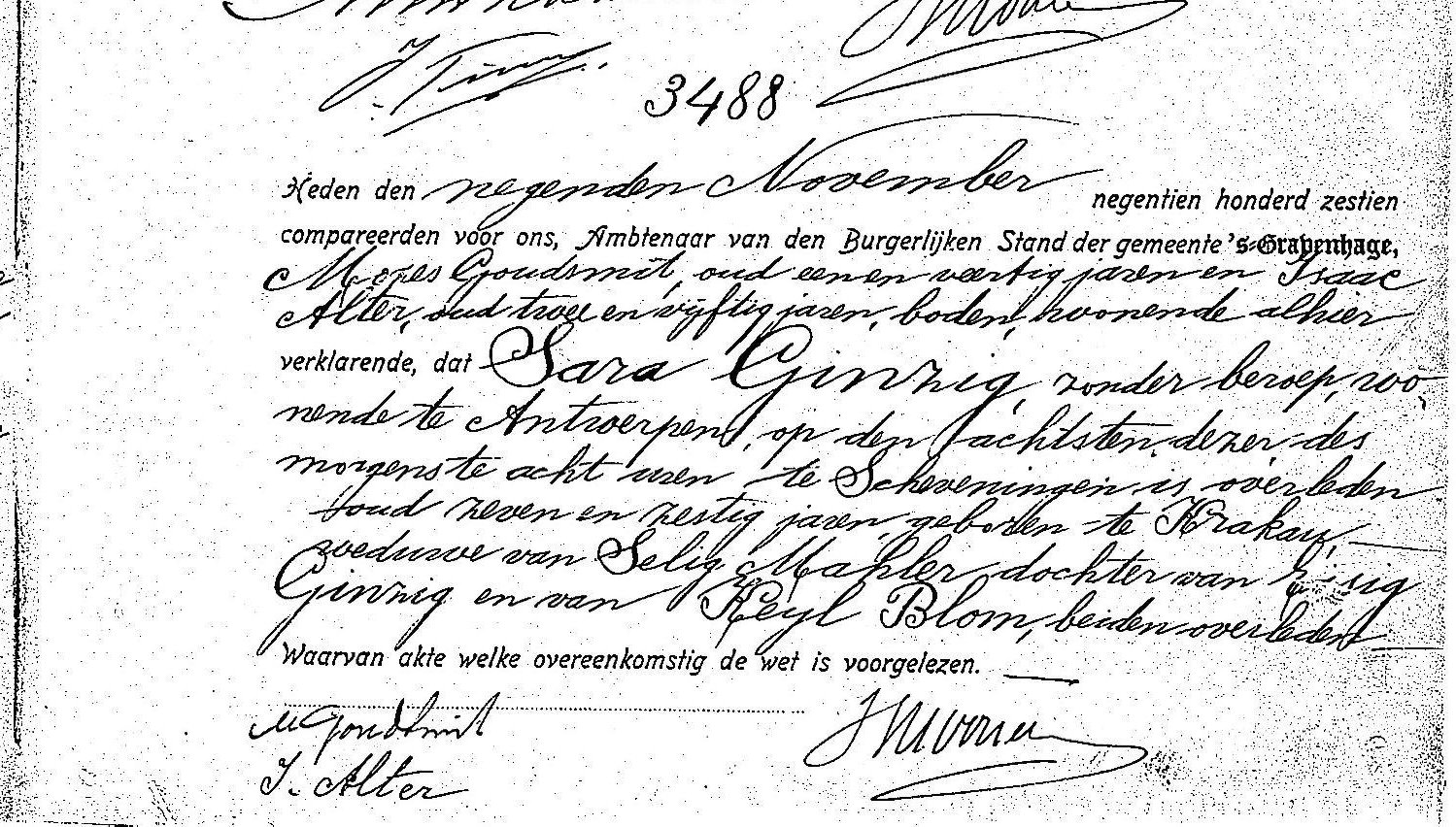Today 9 November 1916 they appear to court (compareerden) for us: the official registrar of the city of 's-Gravenhage (also called Den Haag, The Hague now), Mozes Goudsmit, 41 years old, and Isaac Alter, 52 years old, beadle (see wikipedia above) declare that Sara Ginzig, without a job, living in Antwerp, on 8 November at 8:00 am in the morning is deceased in Scheveningen (place/neighborhood, but maybe they refer to a jail since they appear to court?????), 67 years old, widow of Selig Mahler, daugther of Eisig (?) Ginzig and Keyl Blom, both deceased.