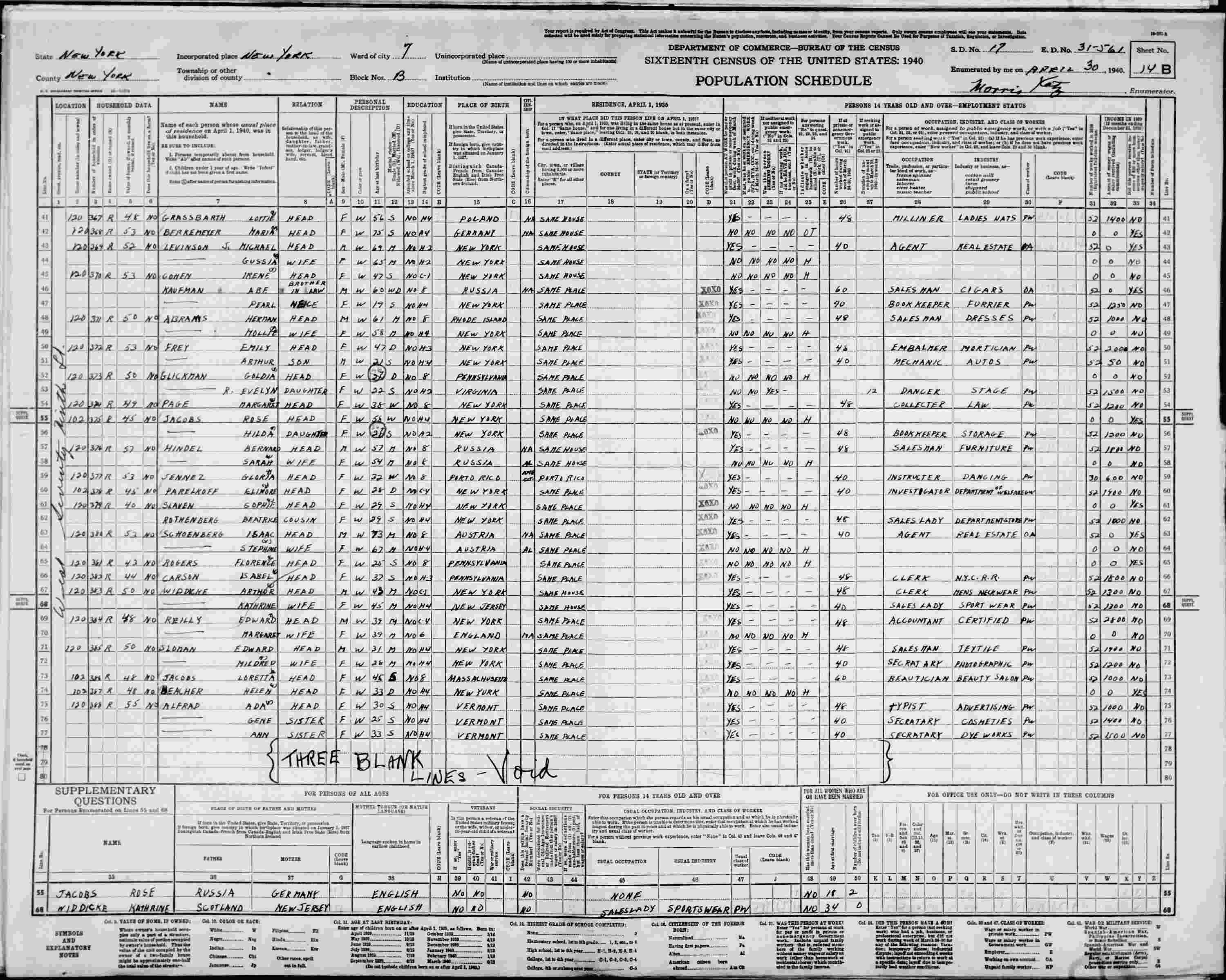 April 30, 1940 - 120 West 79th Street, Block B, Ward 7, Supervisor's District 17, Enumeration District 31-561, New York City, New York, New York.