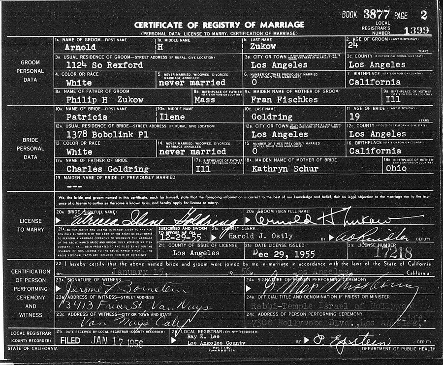 Married: (1) Patricia Ilene Goldring January 15, 1956 in Los Angeles, Los Angeles County, California.(Divorce: May, 1976 in Los Angeles County, California.)