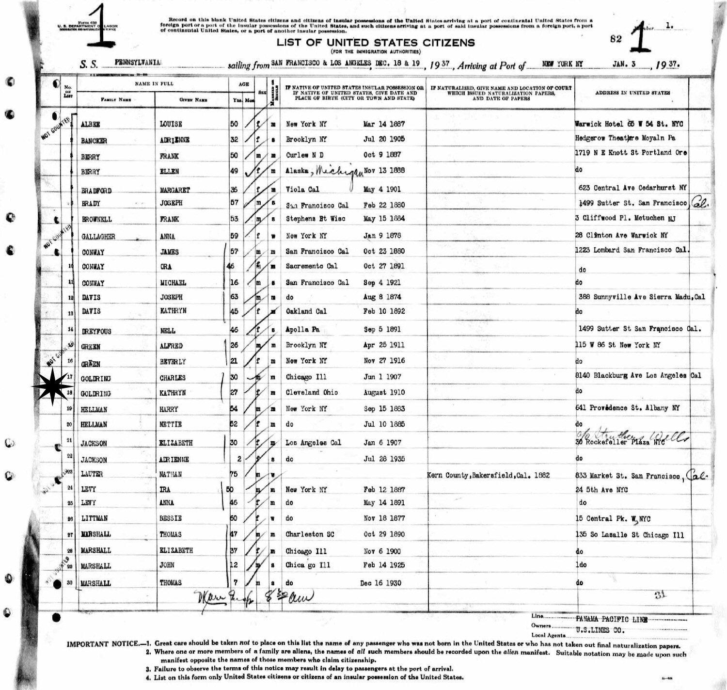 December 18, 1937-January 3, 1938 - S.S. Pennsylvania; San Francisco and Los Angeles to New York.