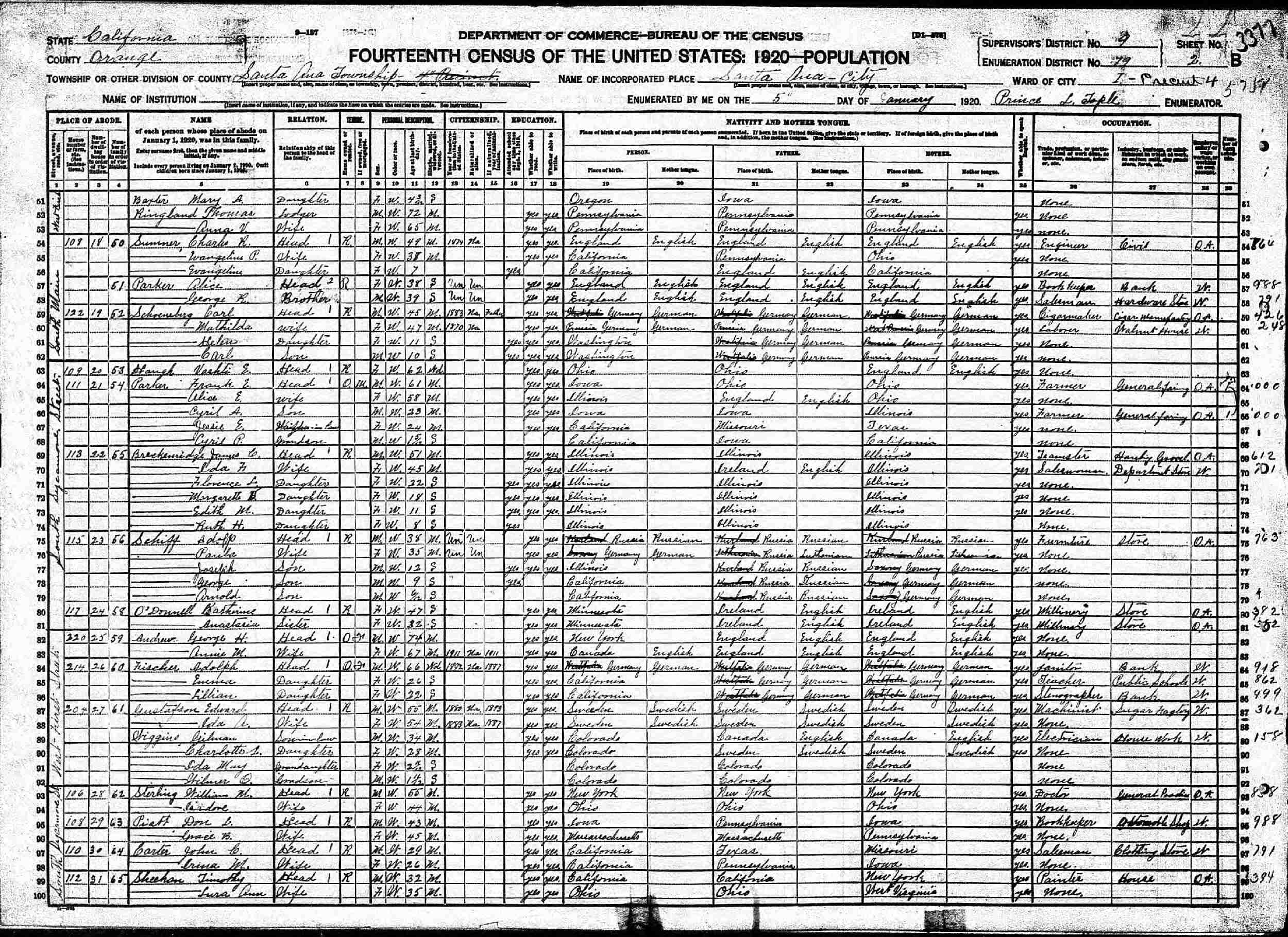January 5, 1920 - 115 South Sycamore Street, Ward I, Precinct 4, Supervisor's District 9, Enumeration District 79, Santa Ana Township, Orange County, California.