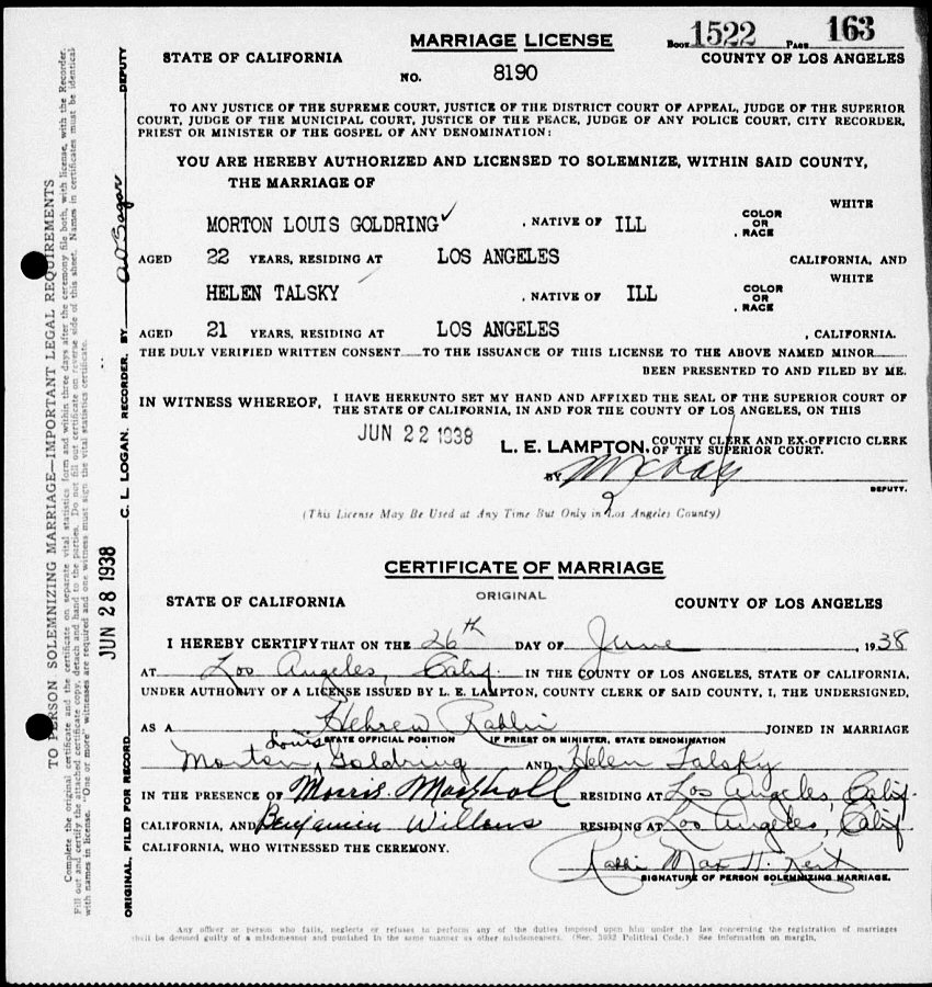 Married: Morton Louis Goldring June 26, 1938 in Los Angeles County, California.