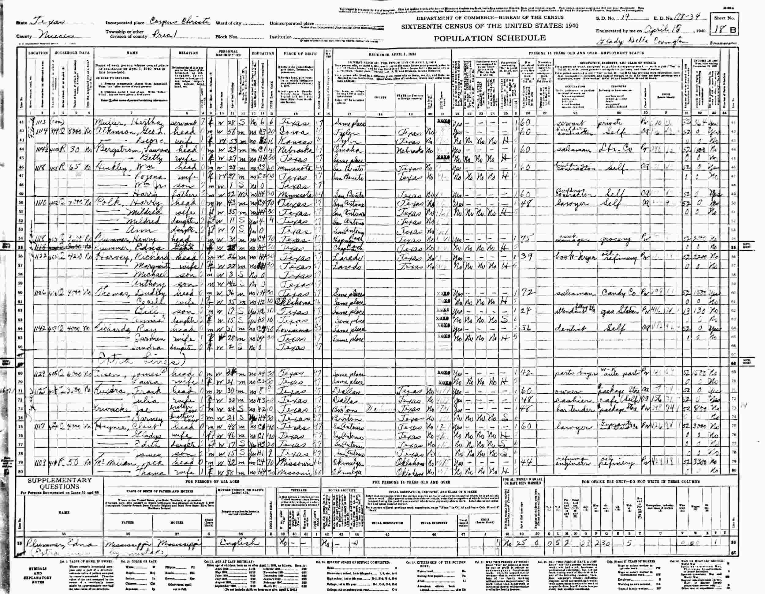 April 17, 1940 - 1113 Florida, Precinct 1, Supervisor's District 14, Enumeration District 178-34, Corpus Christi, Nueces County, Texas.