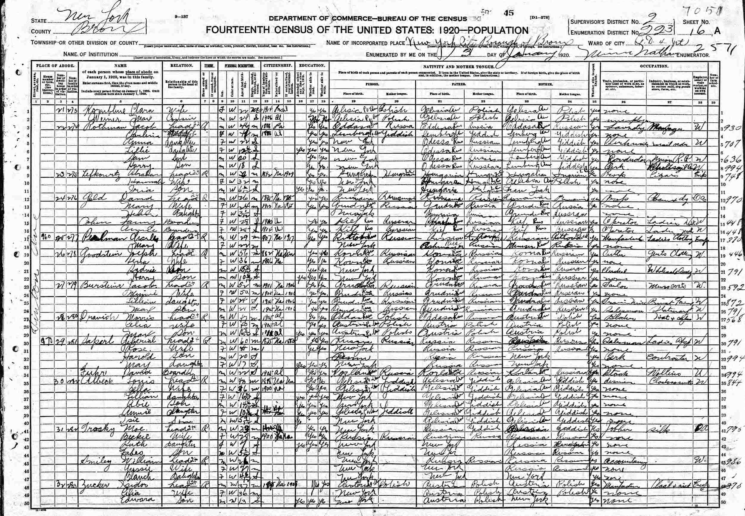 January 3, 1920 - 970 Linton Avenue, Assembly District 4, Supervisor's District 2, Enumeration District 223, Bronx, New York.