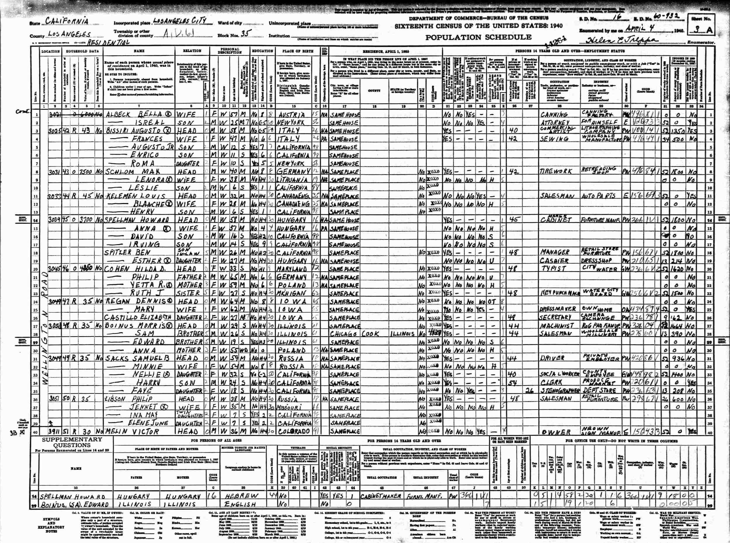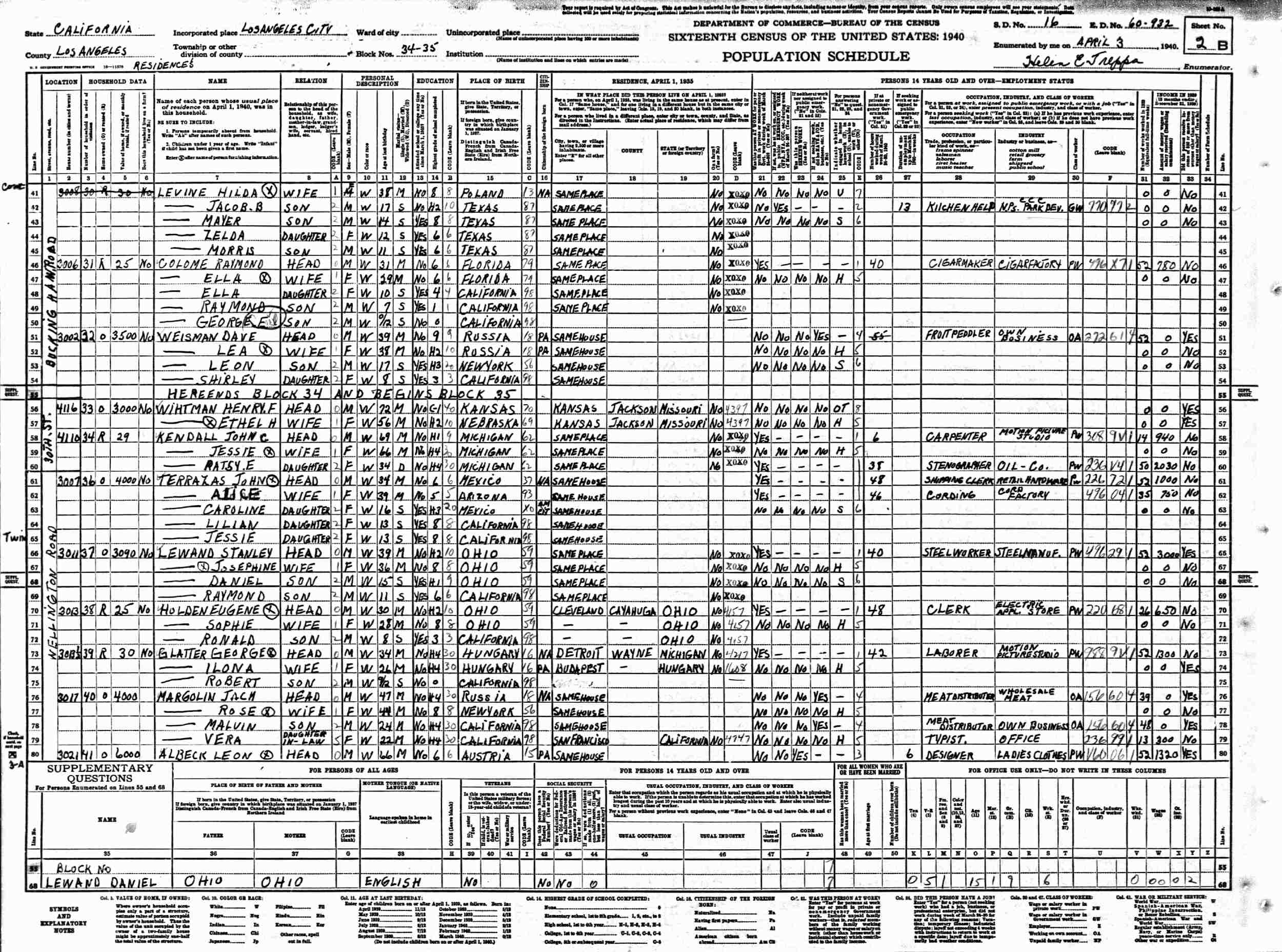 April 3, 1940 - 3021 Wellington Road, Blocks 34-35, Supervisor's District 16, Enumertion District 60-923, Los Angeles, Los Angeles County, California.