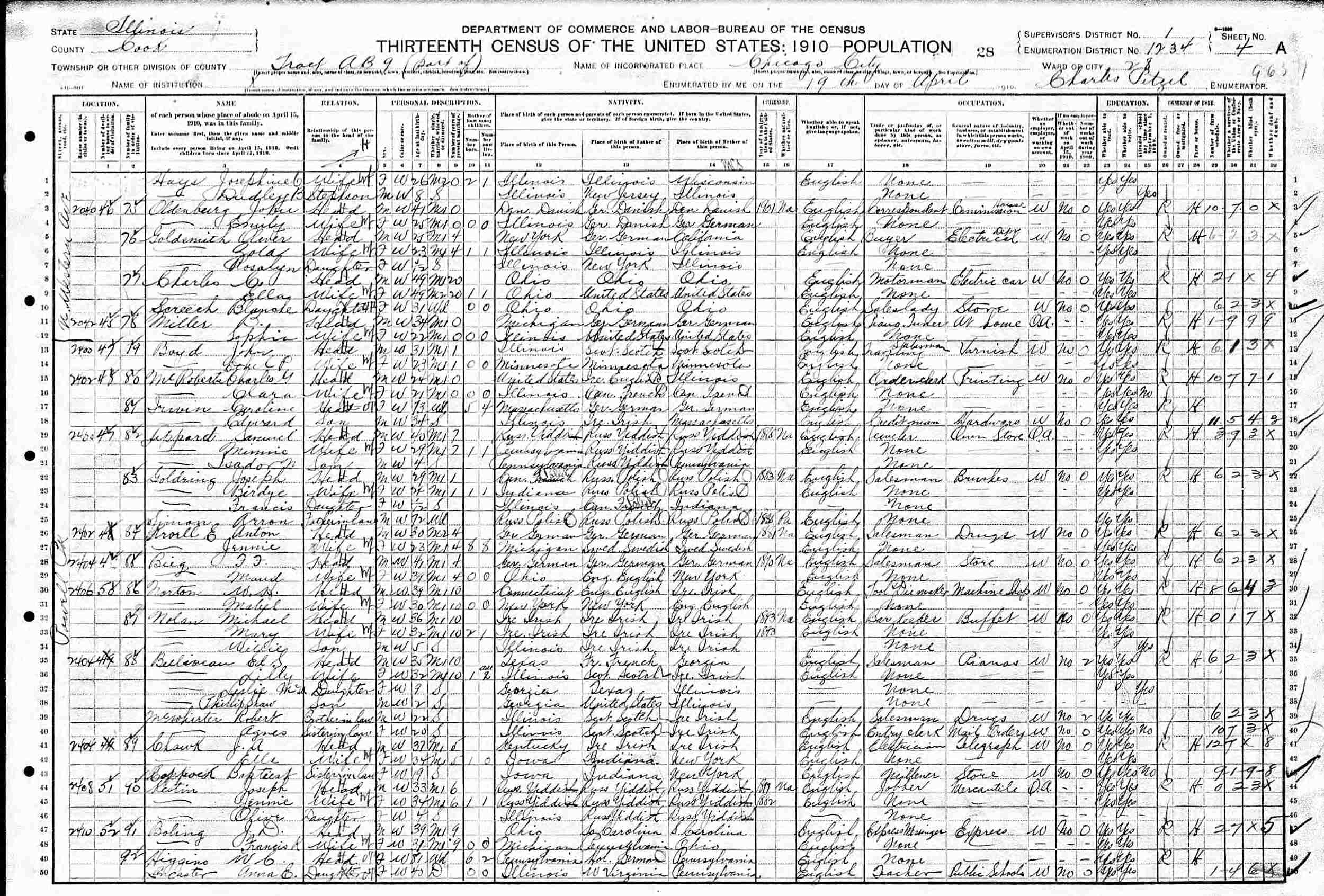April 19, 1910 - 2400 Powell Park, Tract AB 9, Ward 28, Supervisor's District 1, Enumeration District 1234, Chicago, Cook County, Illinois.