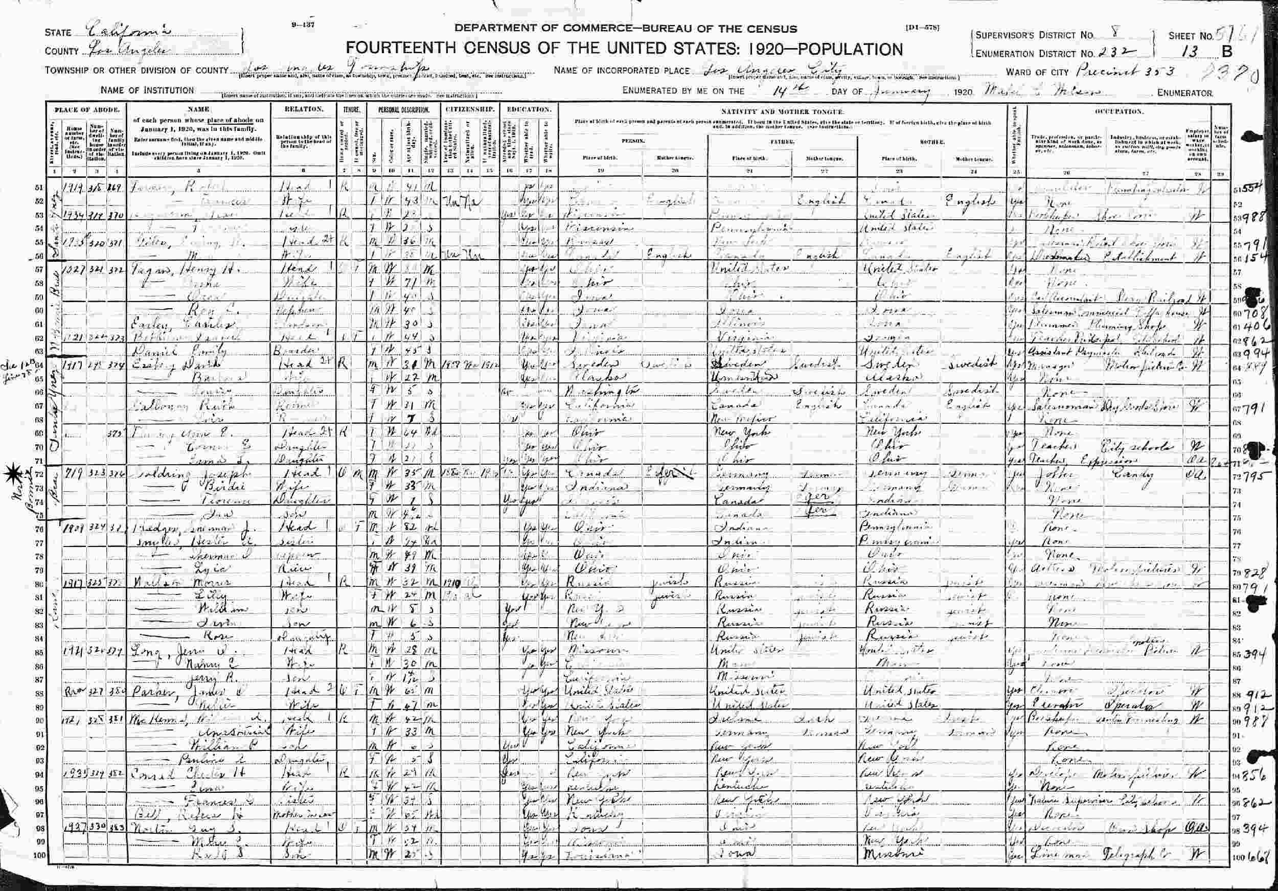 January 14, 1920 - 719 Brea, Ward/Precinct 353, Assembly District 64, Supervisor's District 8, Enumeration District 232, Los Angeles, Los Angeles County, California.