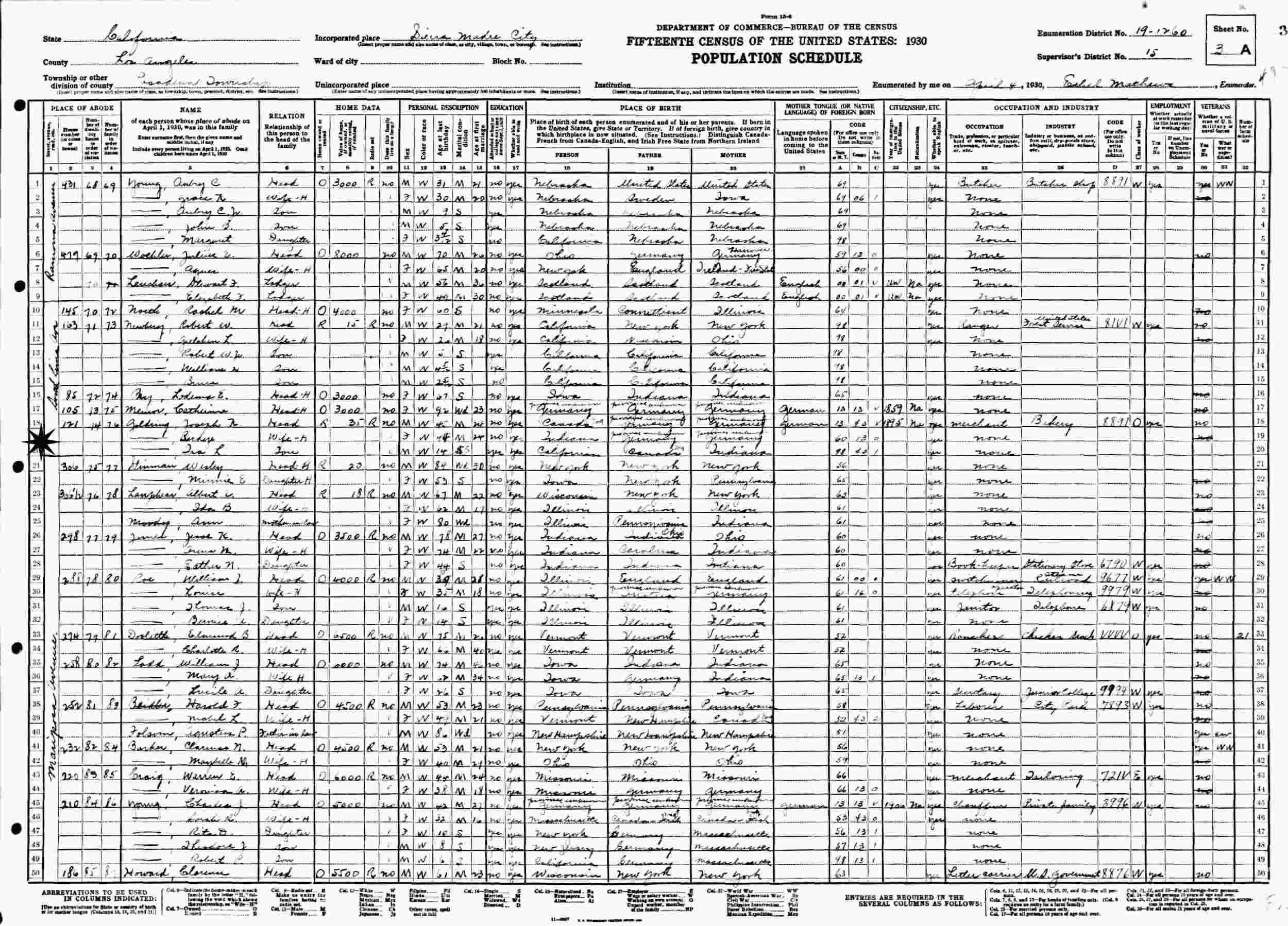 April 4, 1930 - 121 South Louis Avenue, Supervisor's District 15, Enumeration District 19-1260, Pasadena, Los Angeles County, California.