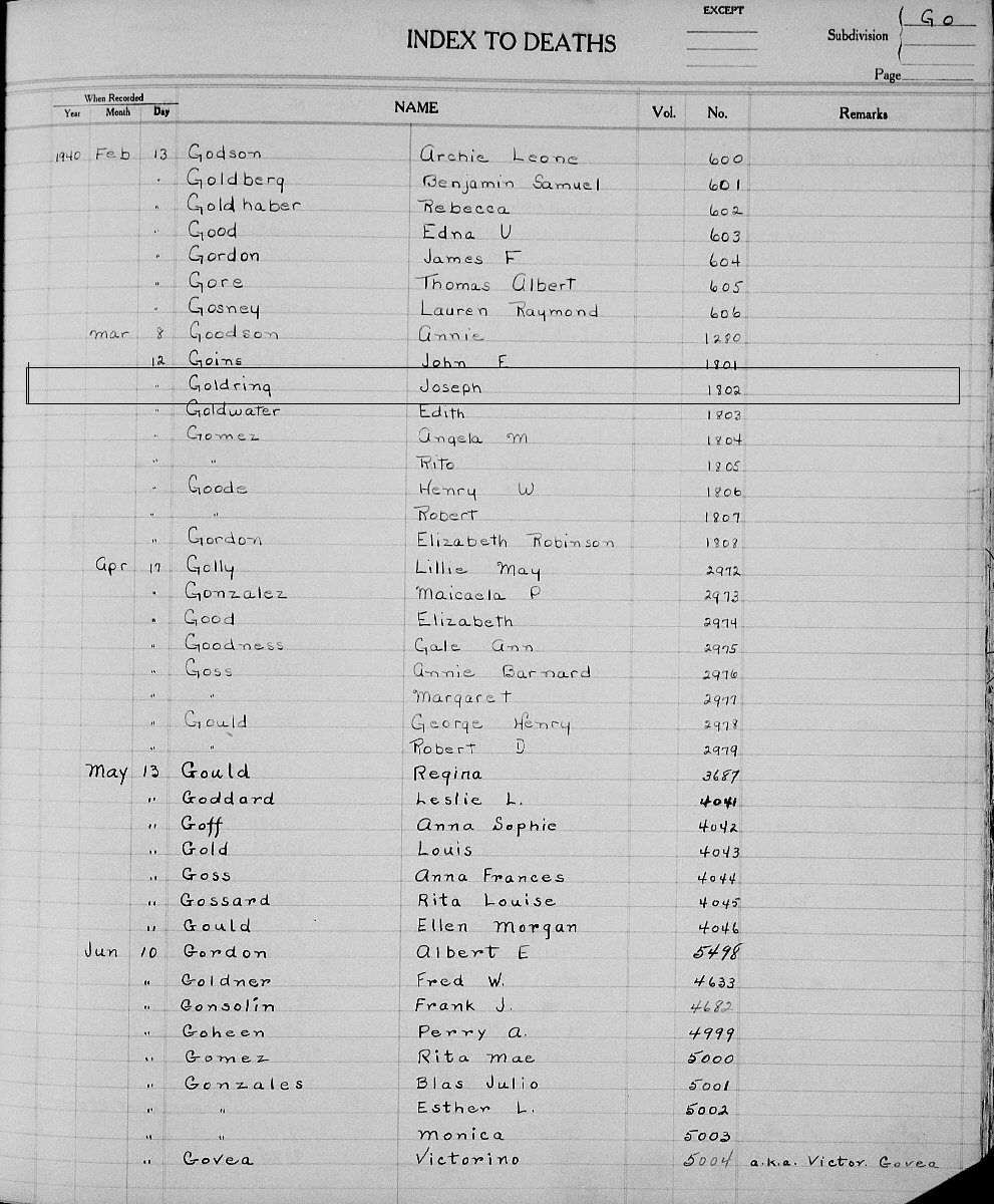 Notes for JOSEPH K GOLDRING: