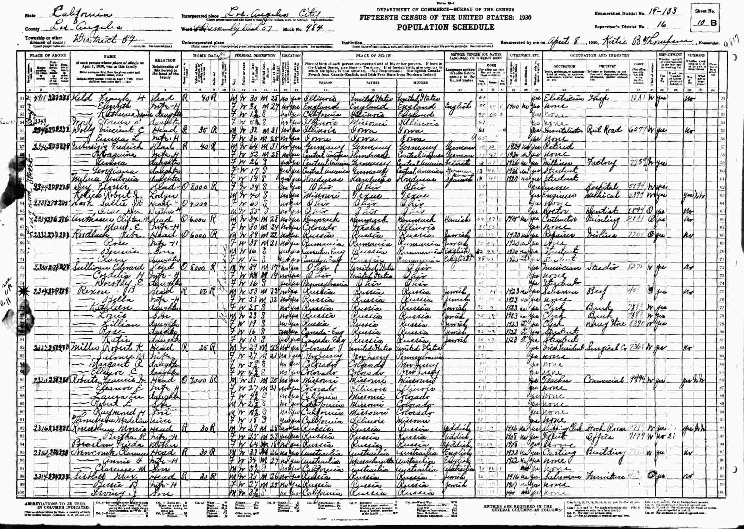 April 8, 1930 - 2304 Longwood Street, Assembly District 57, Block 984, Supervisor's District 16, Enumeration District 19-133, Los Angeles, Los Angeles County, California.