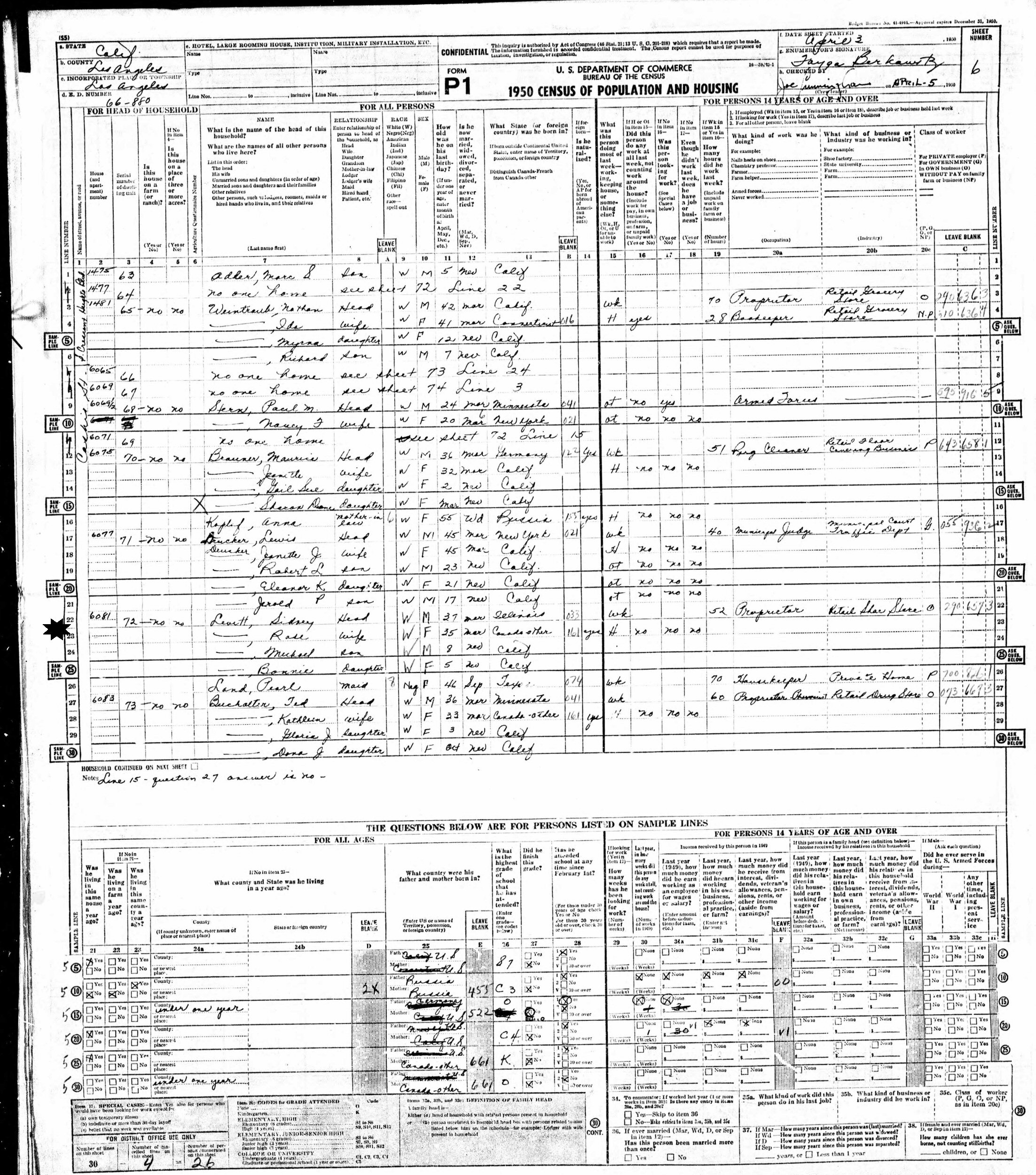 April 3, 1950 - 6081 Cashie Street (?), Enumeration District 66-880, Los Angeles, Los Angeles County, California.