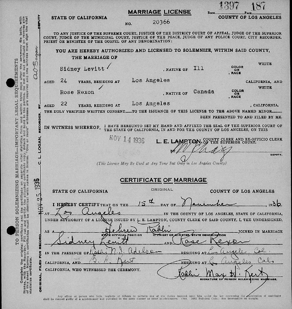 Married: Sidney Bud (nee Levitsky) Levitt November 15, 1936 in Los Angeles, Los Angeles County, California.