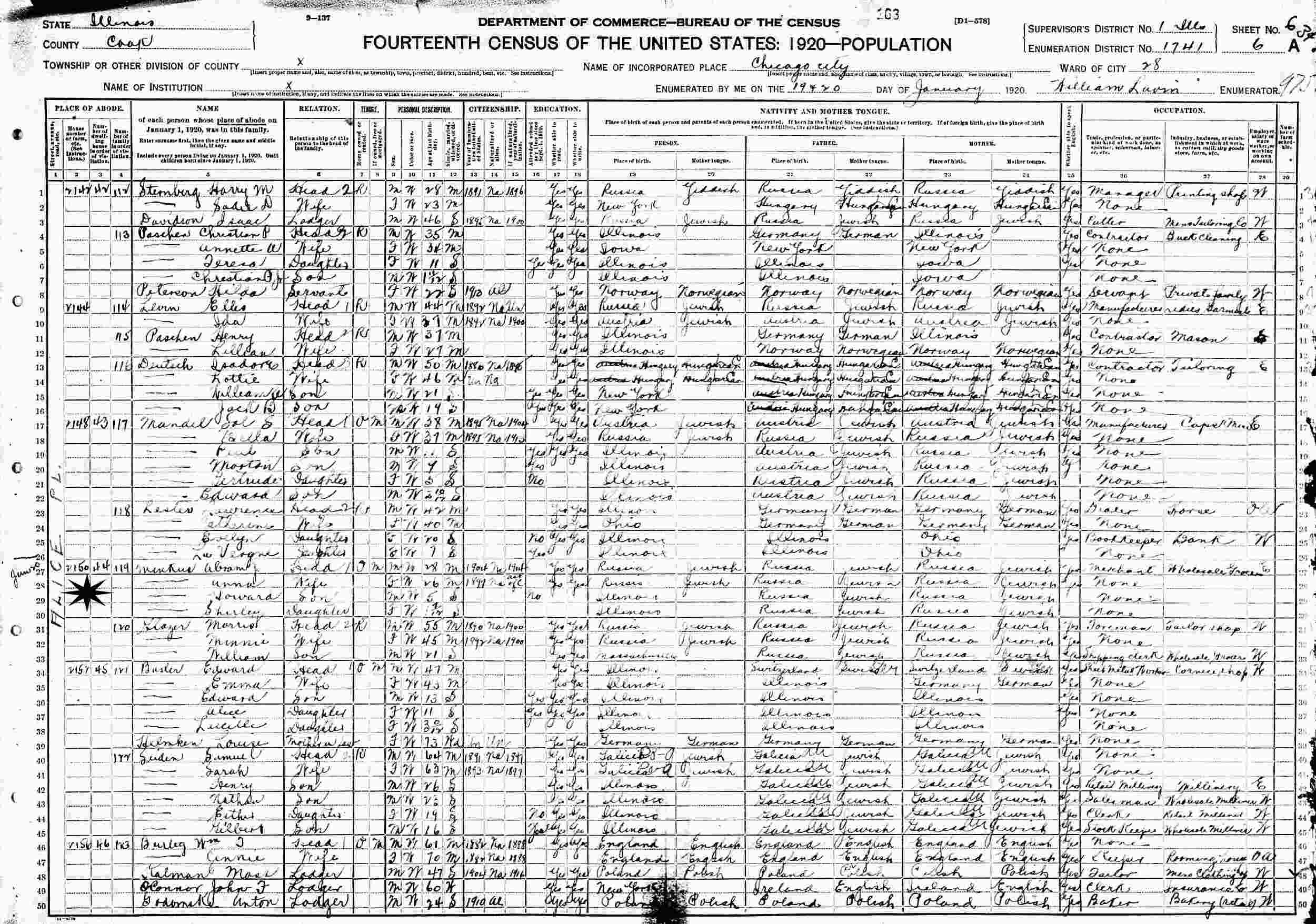 January 19-20, 1920 - 2150 Alice Place, Ward 28, Supervisor's District 1, Enumeration District 1741, Chicago, Cook County, Illinois.