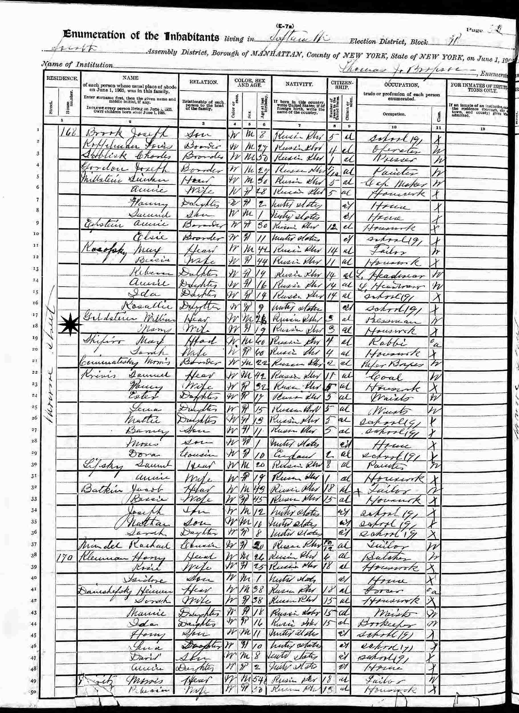 June 1 1905 - New York State - 168 Monroe Street, Assembly District 1, Election District 15, Manhattan, New York.