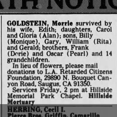 Buried: About April 17, 1989 in Hillside Memorial Park, La Cienga Blvd. Los Angeles, Los Angeles County, California.