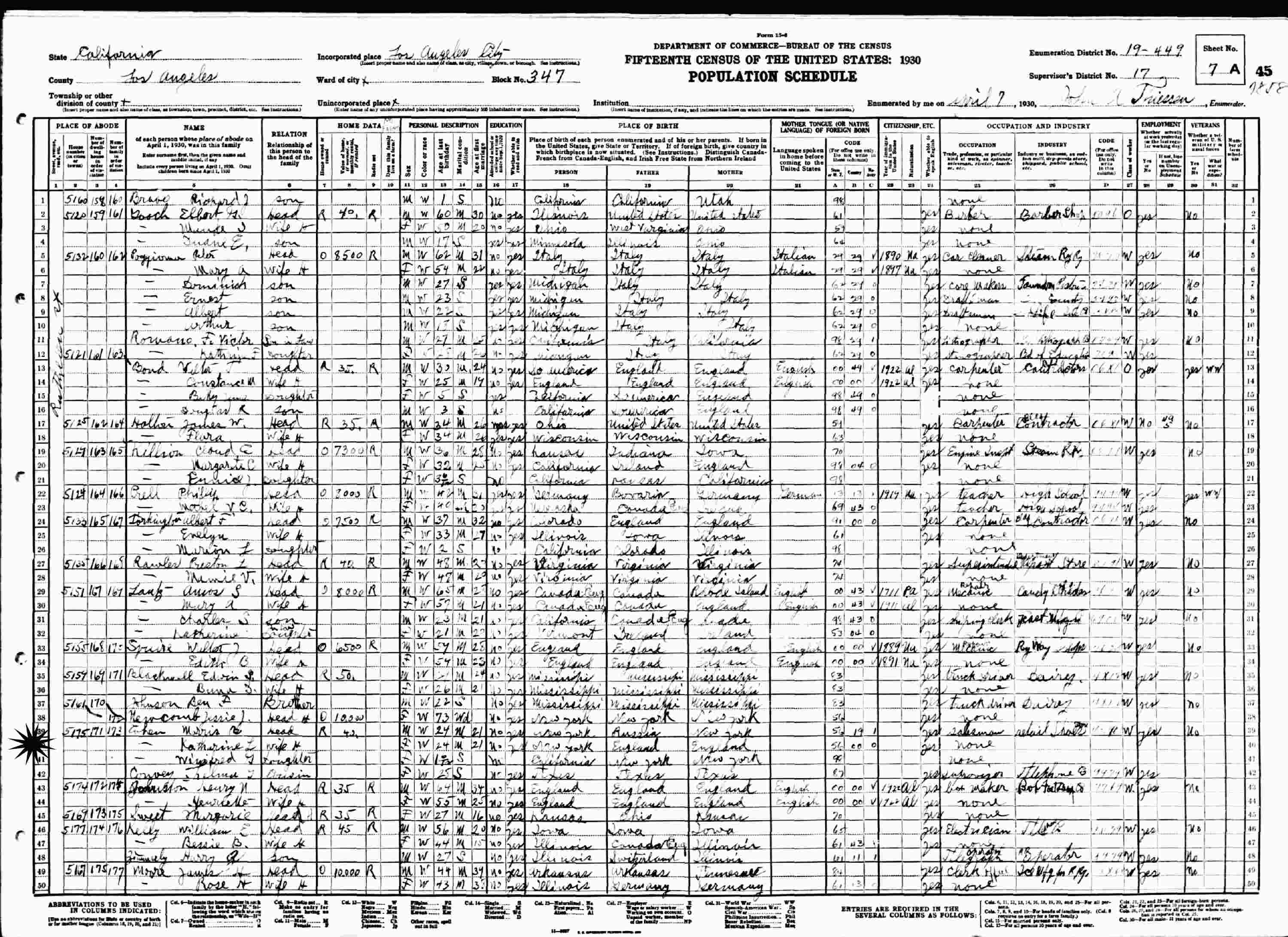 April 7, 1930 - 5175 Ruthedon (sp?), Block 347, Supervisor's District 17, Enumeration District 1-449, Los Angeles, Los Angeles County, California.