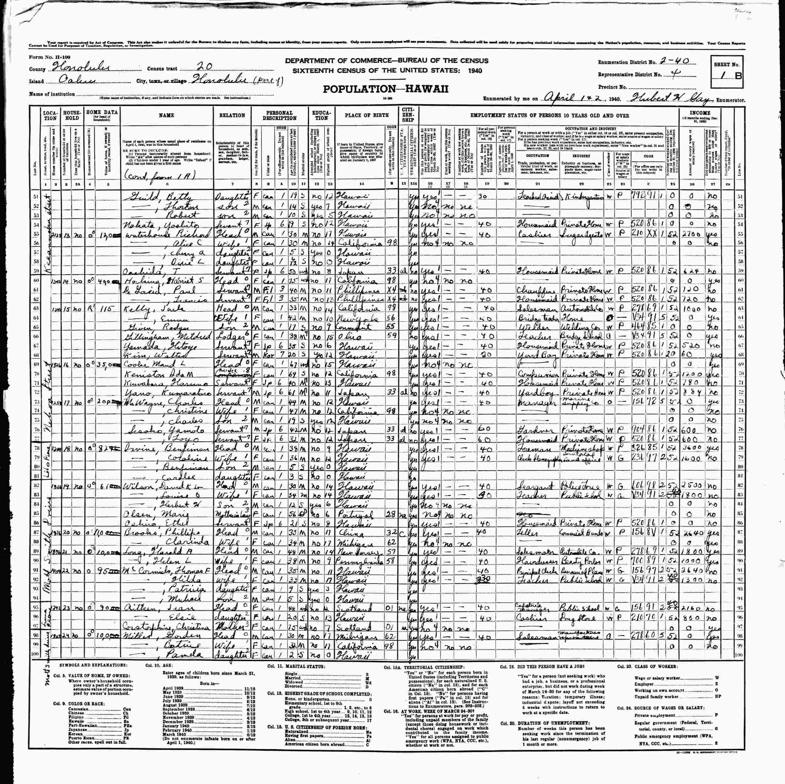 April 1-2, 1940 - 1248 Nehoa Street, Census Tract 20, Representative District 4, Enumeration District 2-40, Honolulu, Honolulu, Oahau.