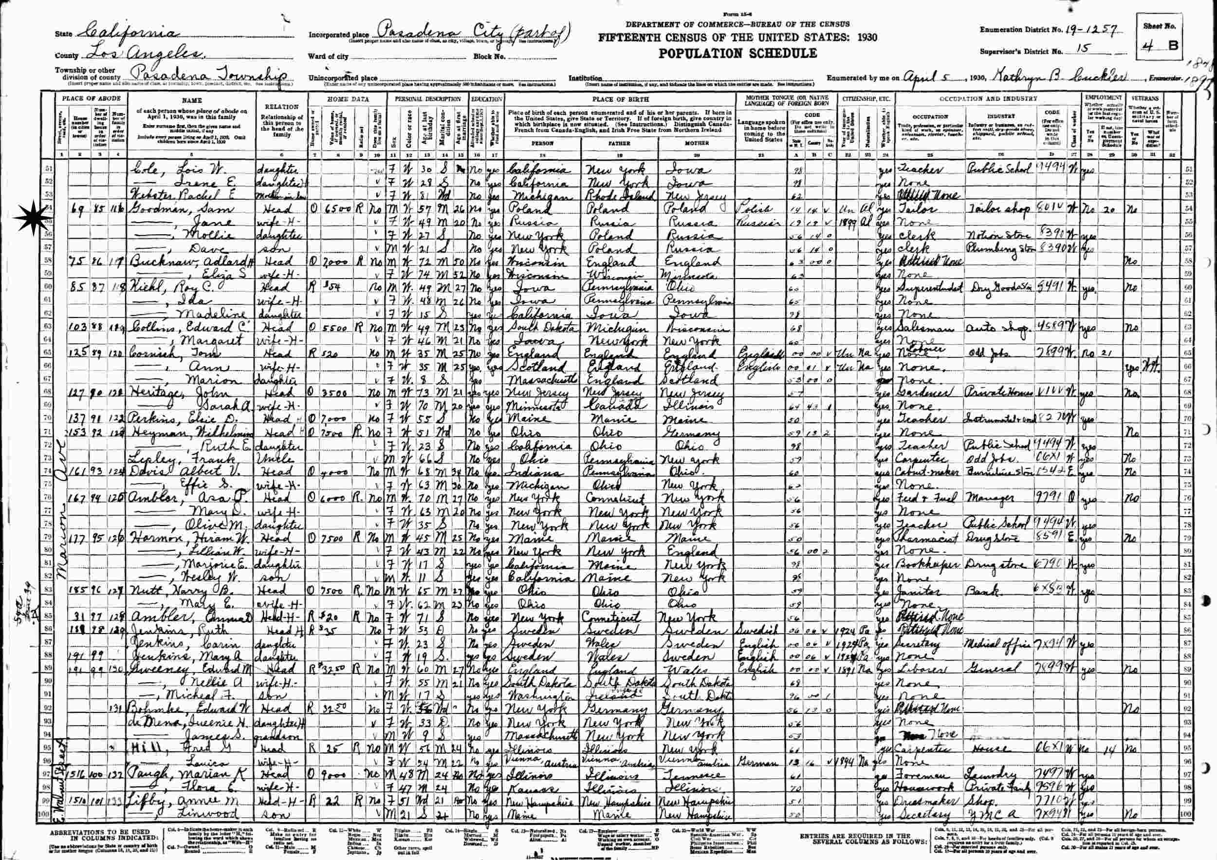 April 5, 1930 - 69 Marion Avenue, Supervisor's District 15, Enumeration District 19-1257, Pasadena, Los Angeles County, California.