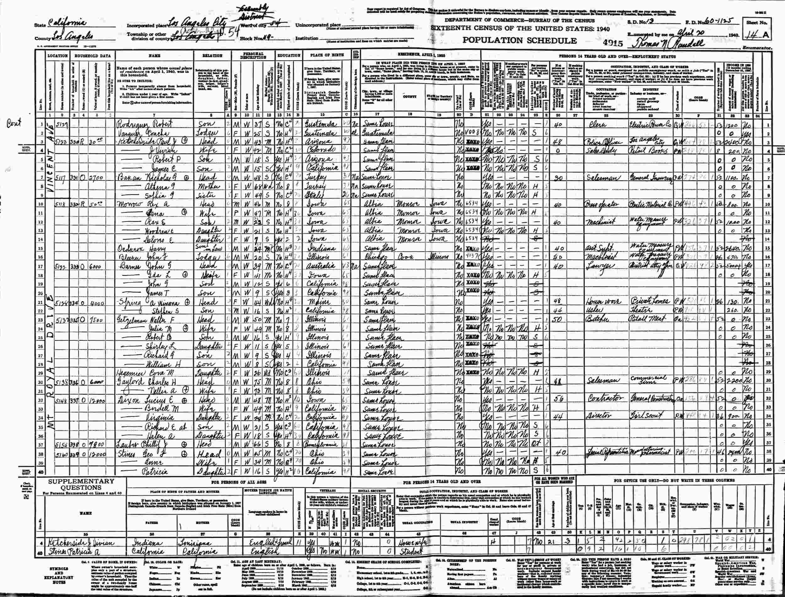 April 20, 1940 - 5118 Mt. Royal Drive, Assembly District 54, Block 49, Supervisor's District 13, Enumeration District 60-1125, Los Angeles, Los Angeles County, California.