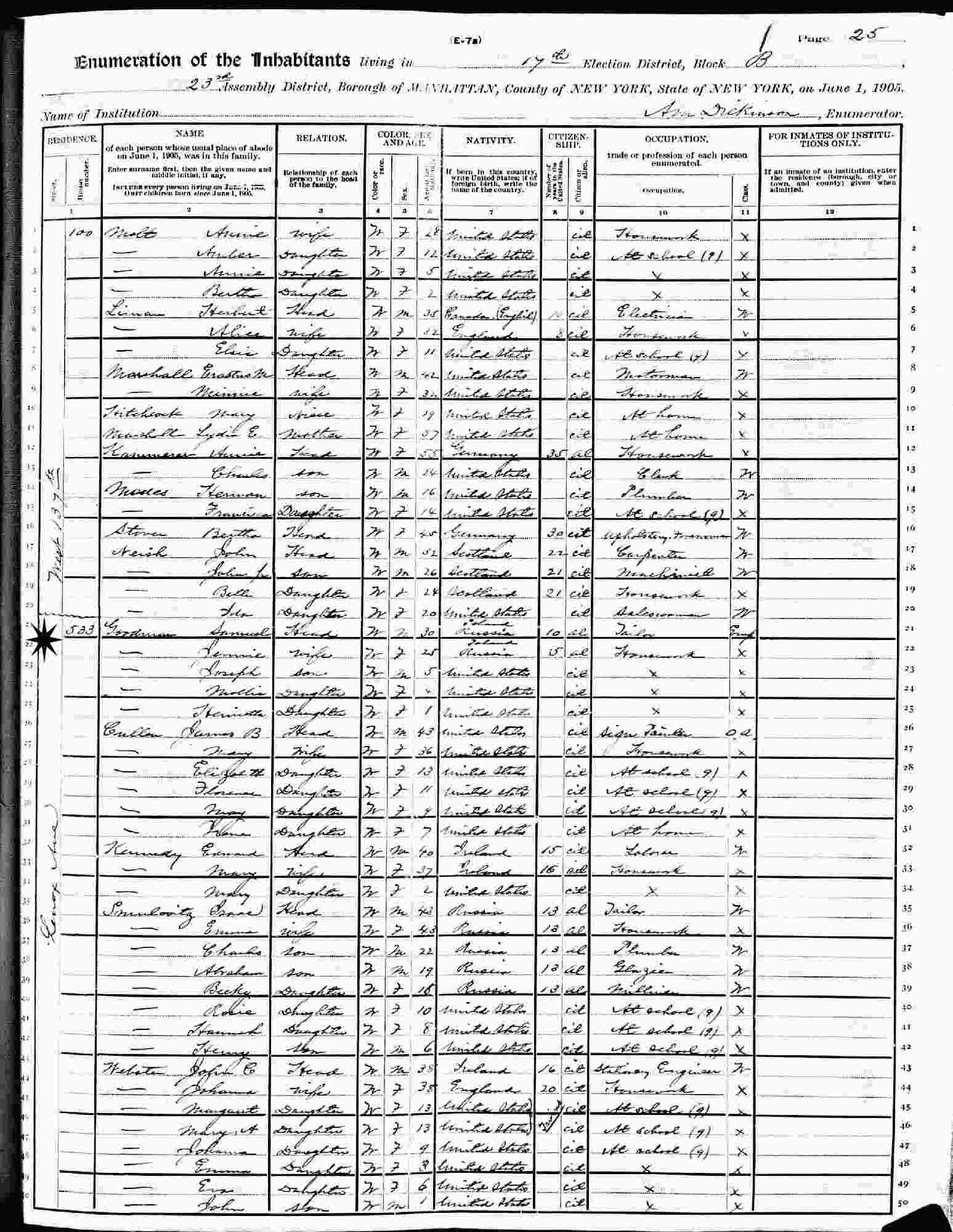 June 1, 1905 - New York State: 533 West 137th, Block B, 23rd Assembly District, Election District 17, Manhattan, New York.
