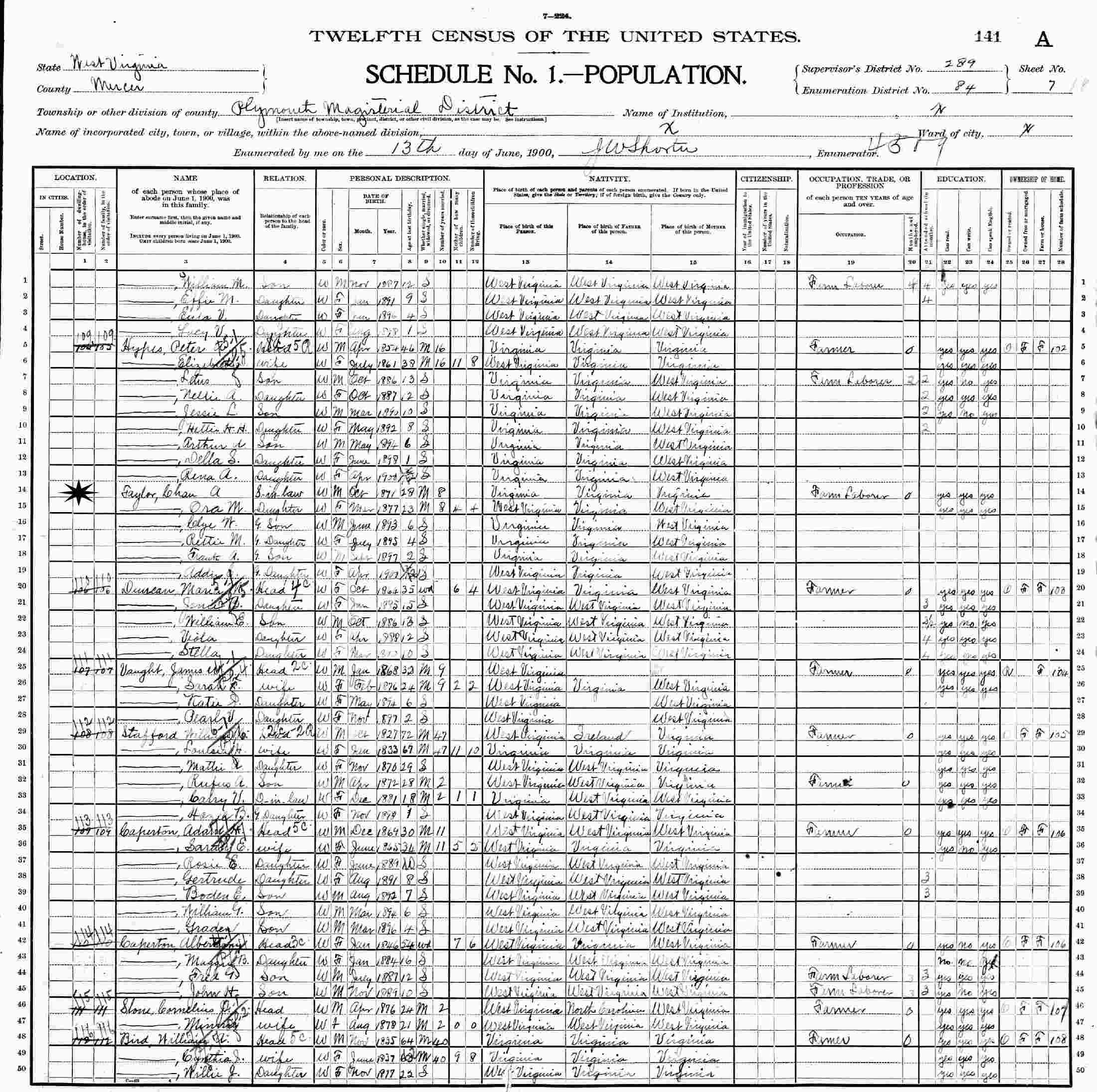 June 13, 1900 - Supervisor's District 289, Enumeration District 84, Plymouth Magisterial District, Mercer County, West Virginia (w/maternal grandparents).