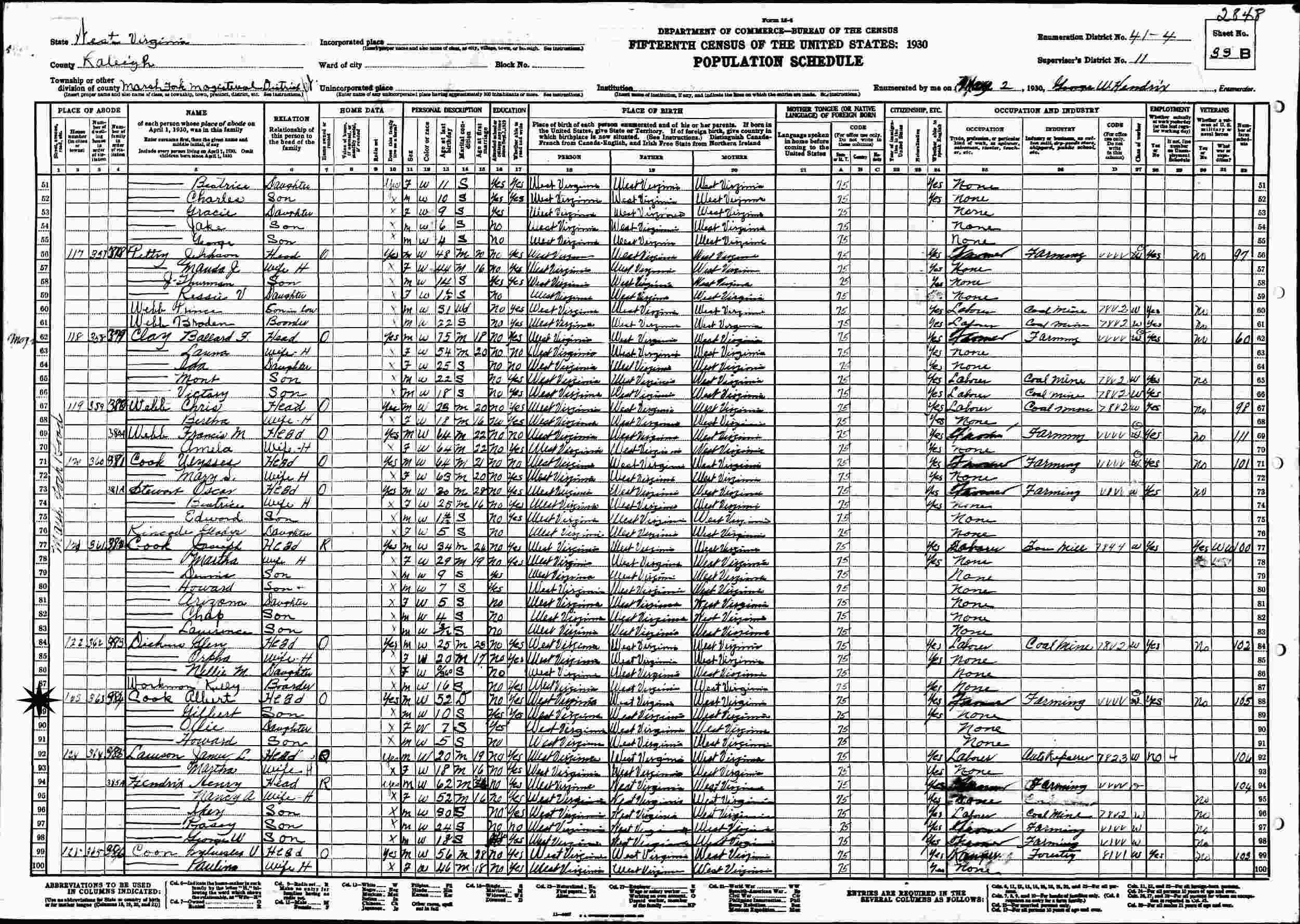 May 2, 1930 - 123 Marsh Fork Road, Supervisor's District 11, Enumeration District 41-4, Marsh Fork Magisterial Districr, Raleigh County, West Virginia.
