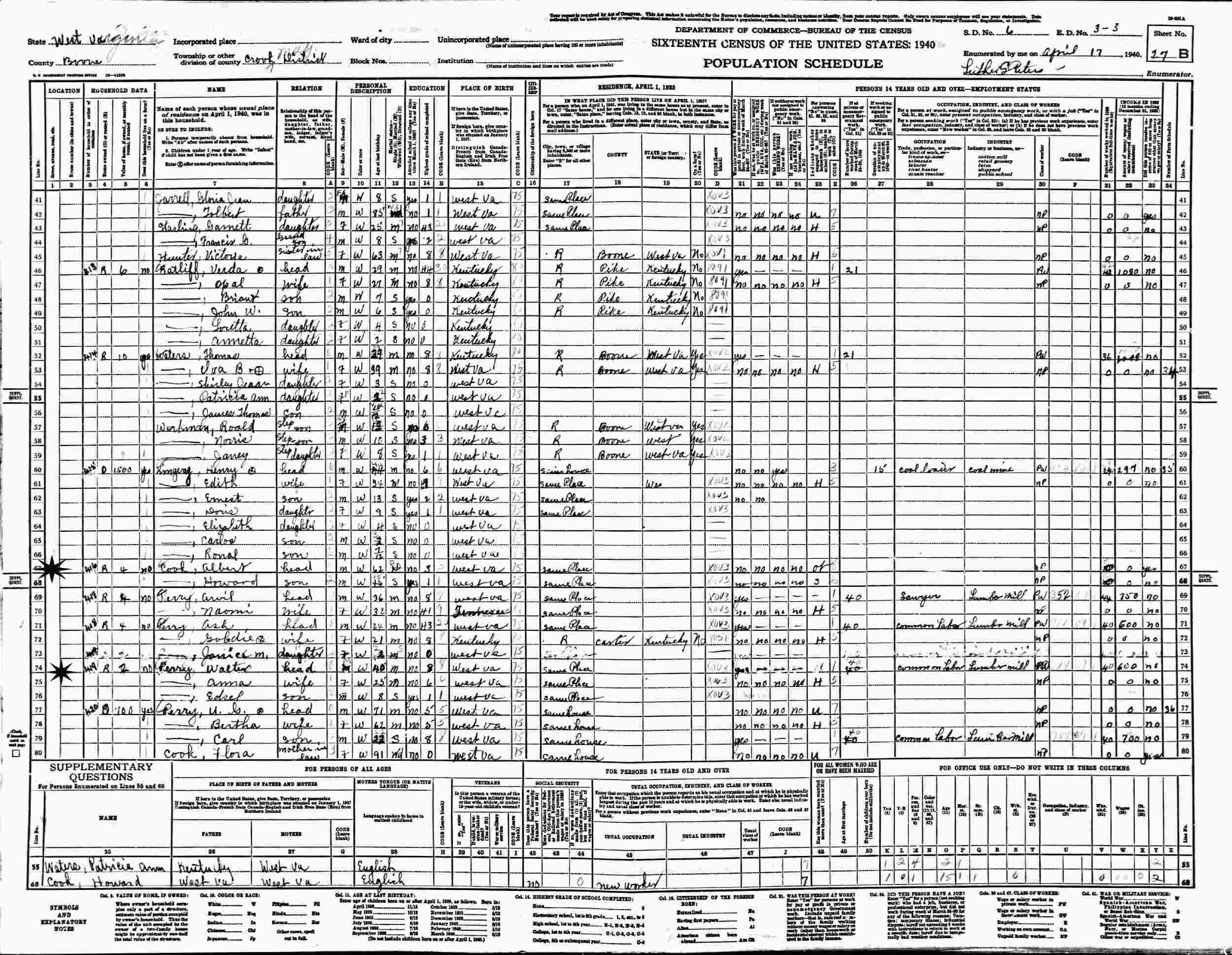 April 17, 1940 - Supervisor's District 6, Enumeration District 3-3, Crook Magisterial District, Boone County, West Virginia.