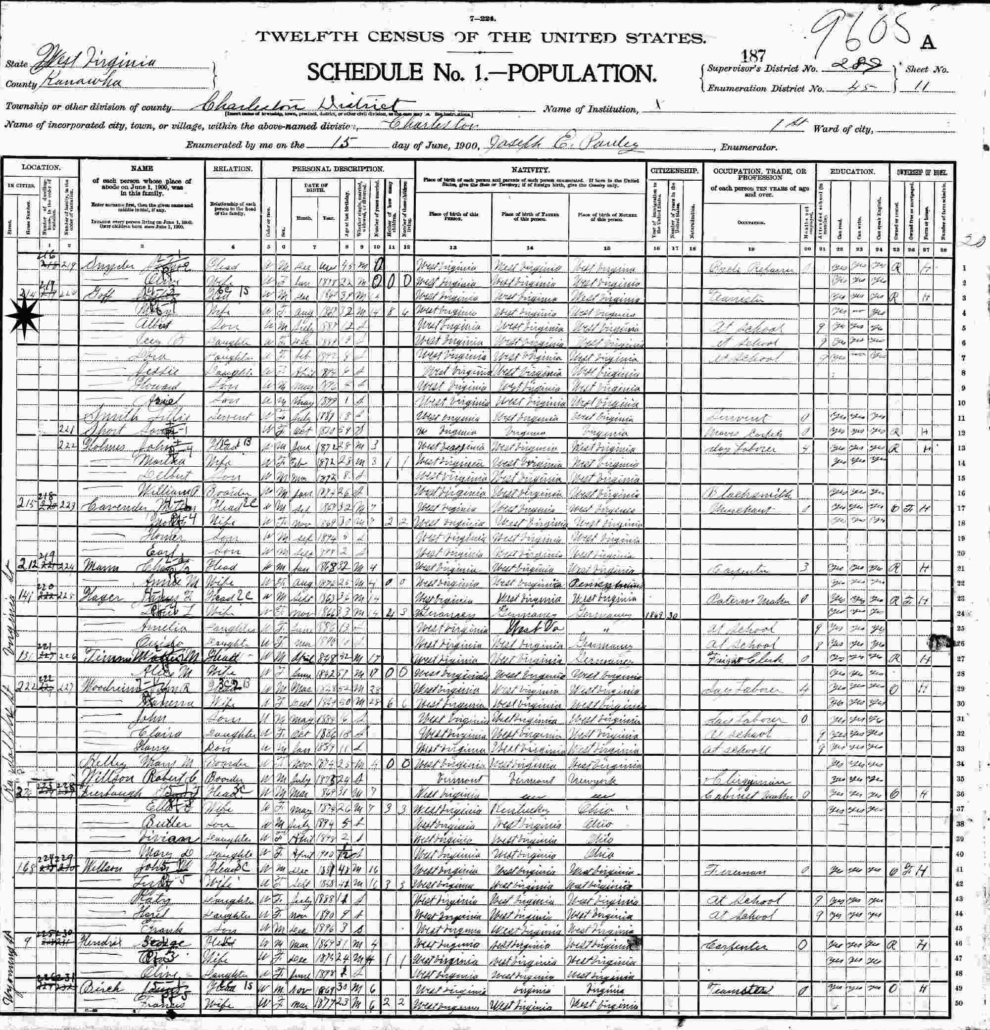 June 15, 1900 - 214 Virginia Street, Supervisor's District 289, Enumeration District 45, Charleston, Kanawha County, West Virginia.