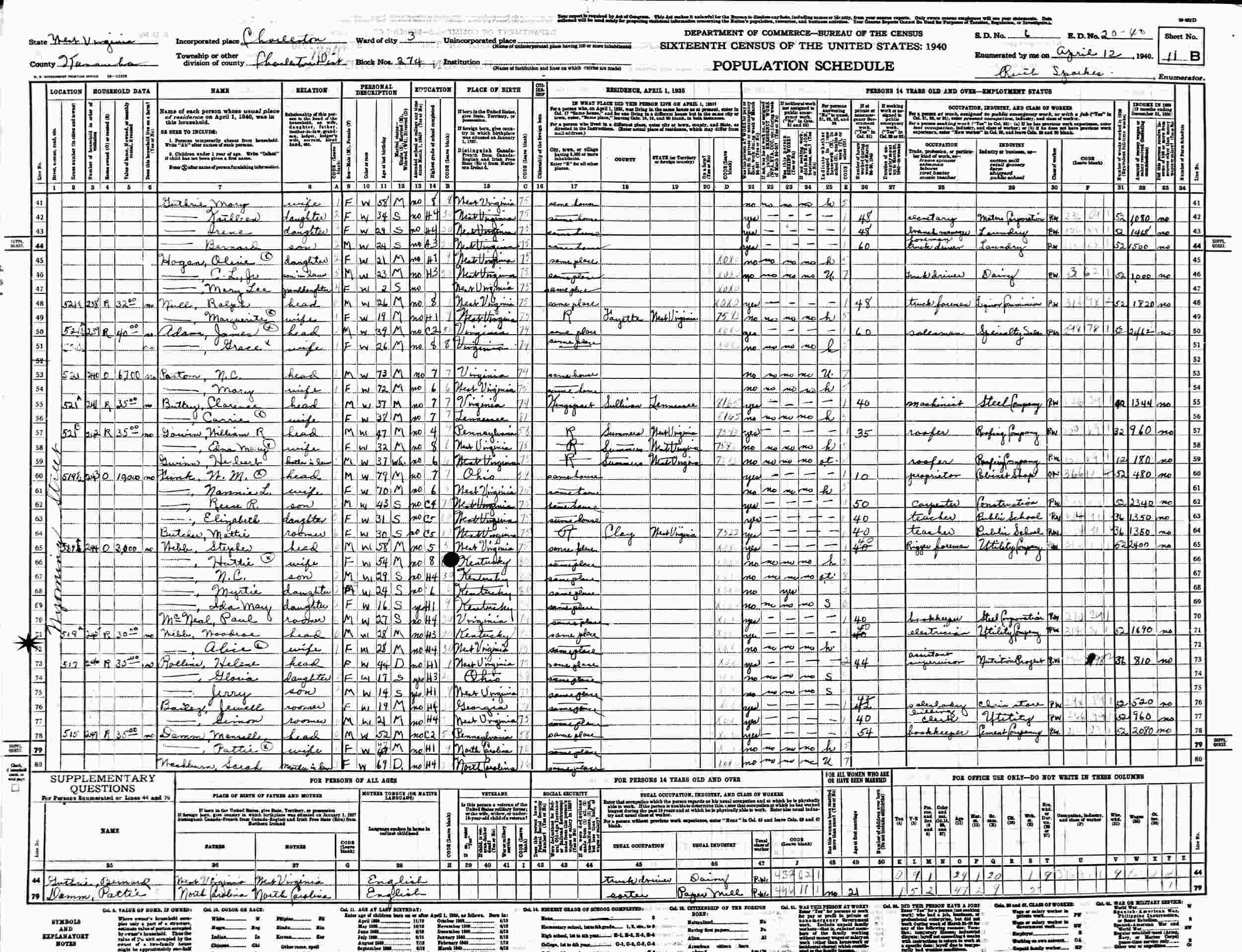 April 12, 1940 - Ward 3, Block 274, Supervisor's District 6, Enumeration District 20-40, Charleston, Kanawha County, West Virginia.