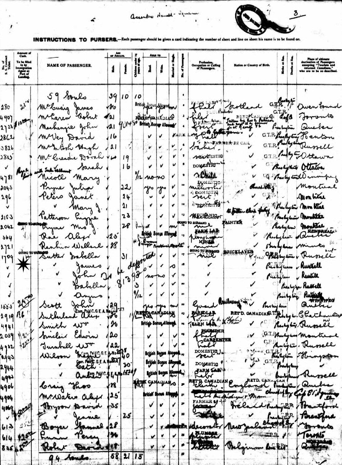 June 18, 1908 - Glasgow, Scotland to Montreal, Quebec, Canada Vessel: Cassandra.