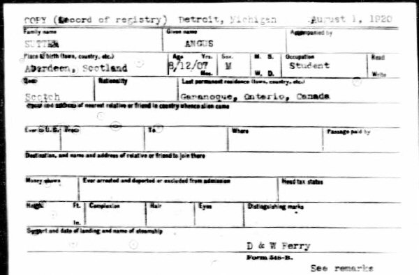 August 1, 1920 - Canada to Detroit Michigan.