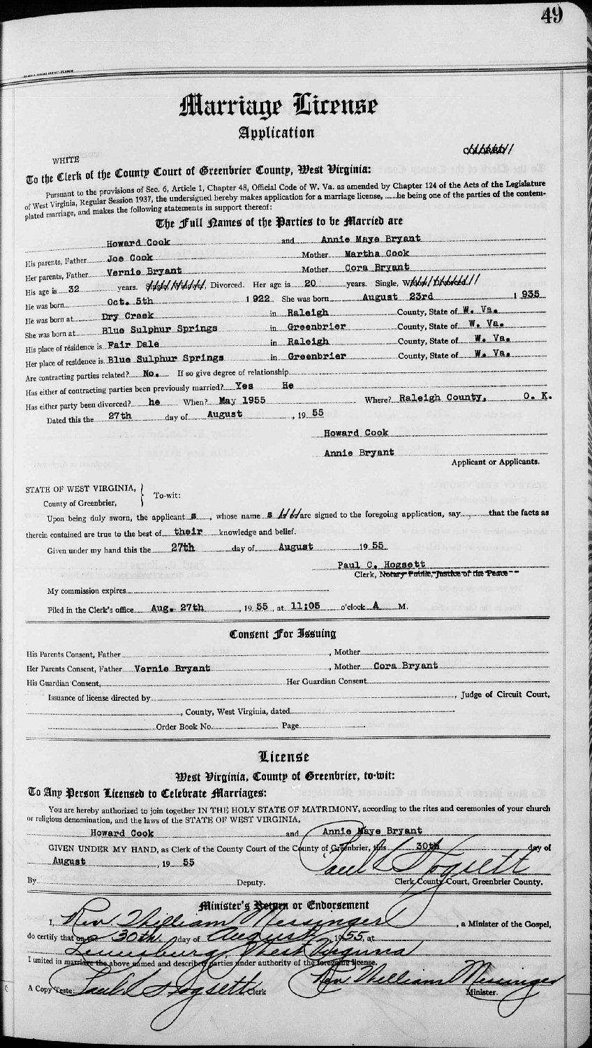 Married: Howard Cook August 30, 1955 in Lewisburg, Greenbrier County, West Virginia.