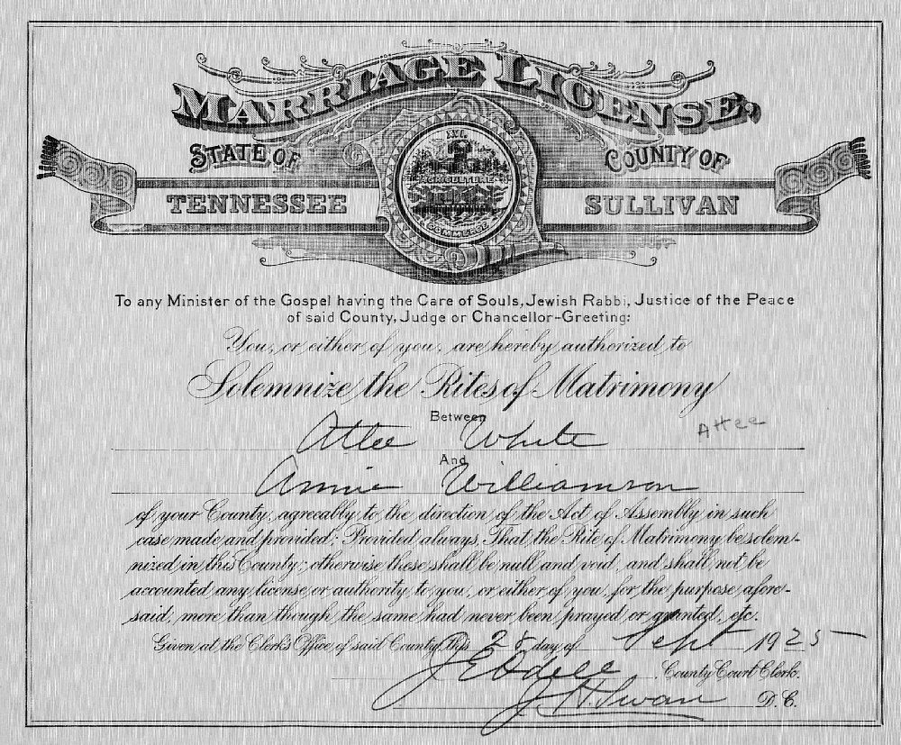 Married: Atlee Allen White September 28, 1925 in Sullivan County, Tennessee.