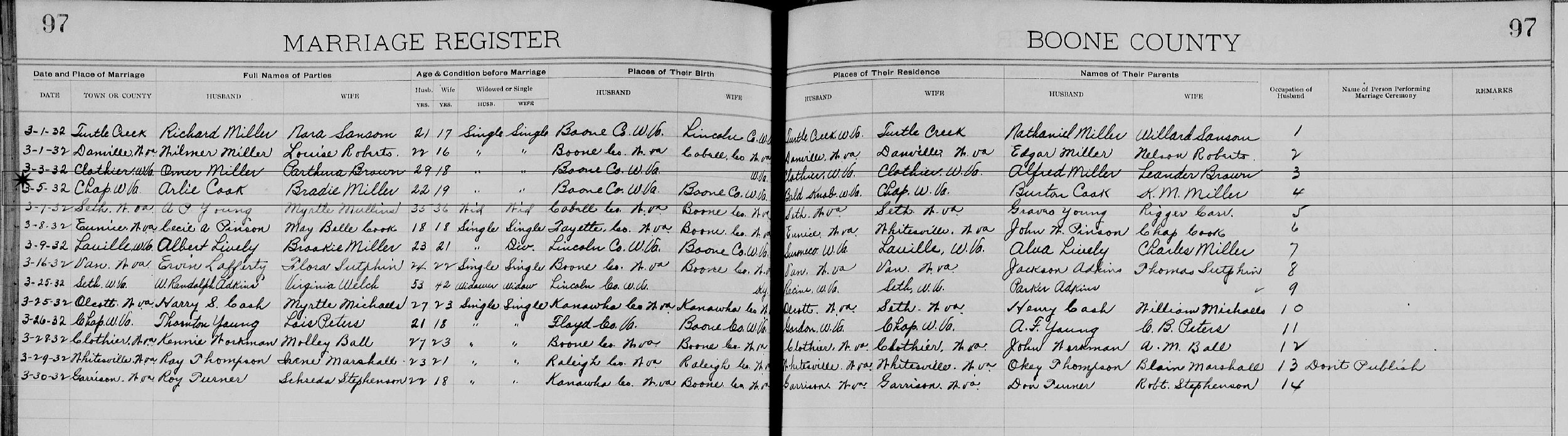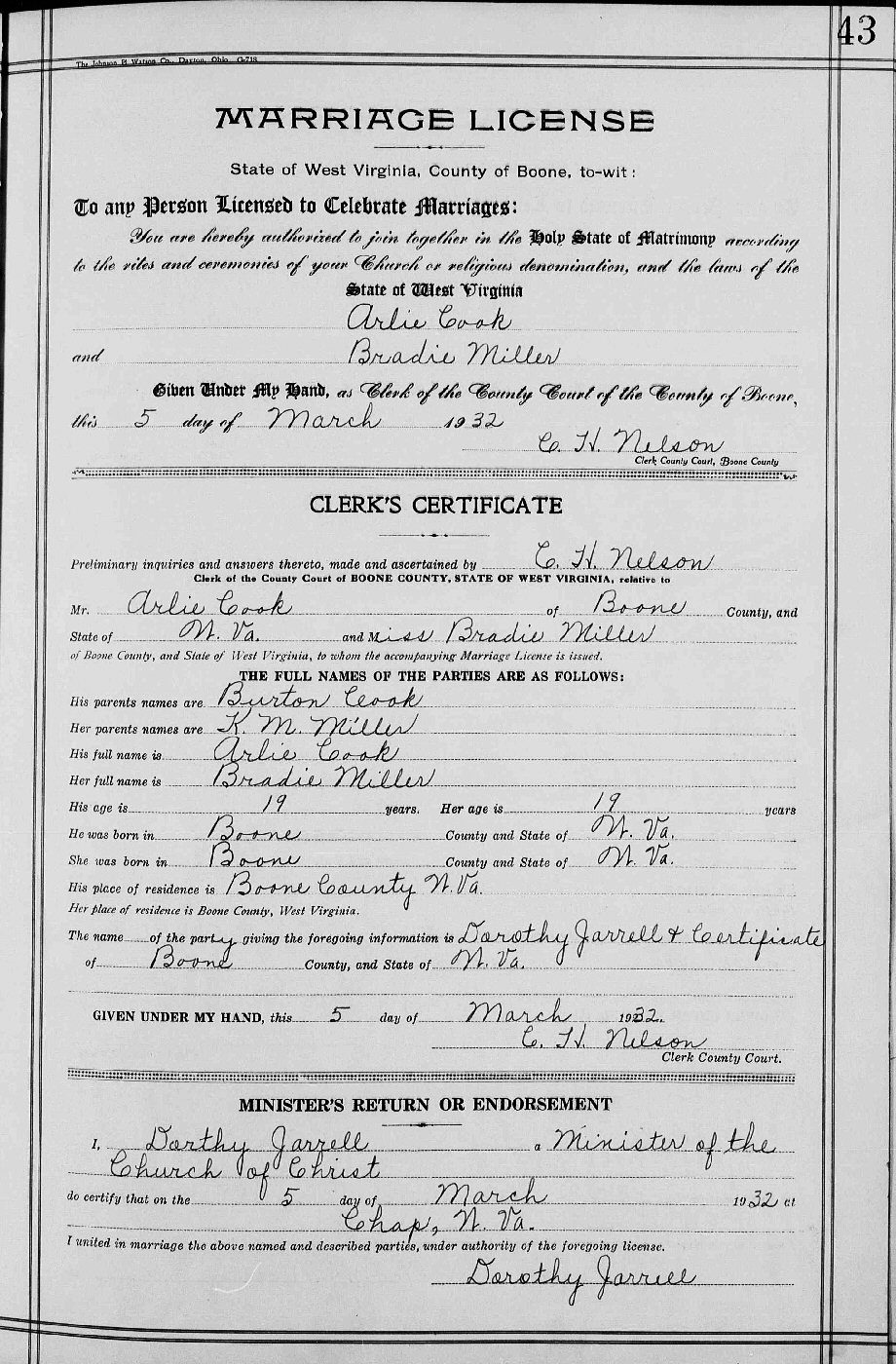 Married: Bradie Miller March 5, 1932 in Chap, Boone County, West Virginia.